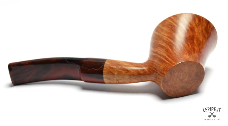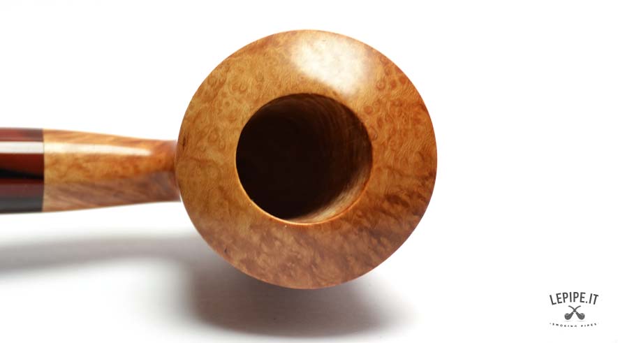 La finitura liscia valorizza una radica luminosa, con venature morbide e fluide che accompagnano naturalmente le curve del design. Il passaggio tra cannello e bocchino in tonalità ambrata è armonioso, creando una continuità visiva calda e raffinata.