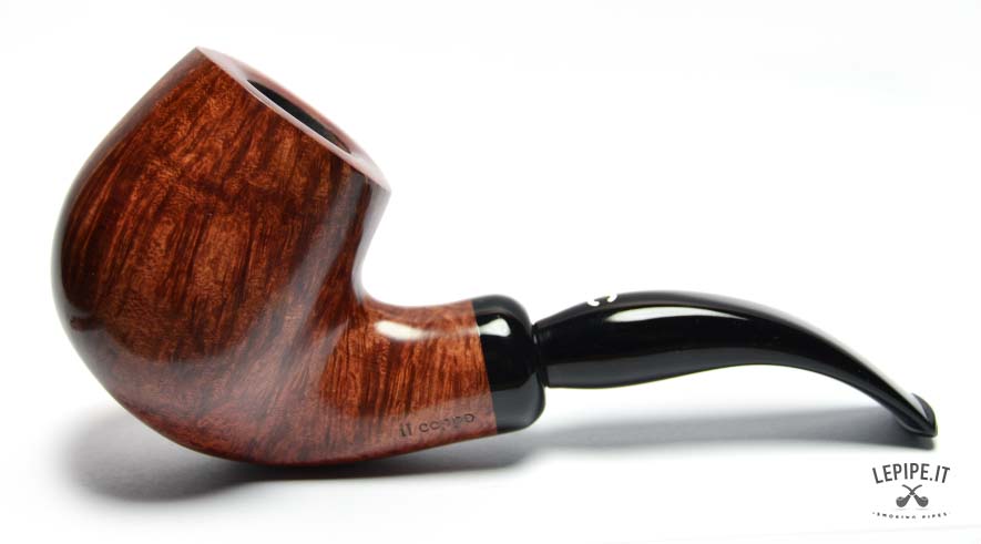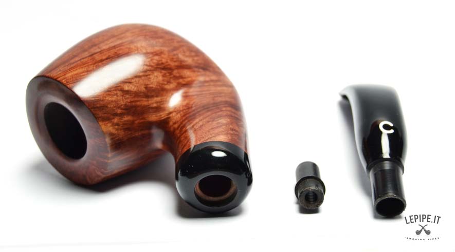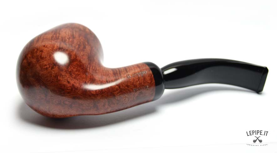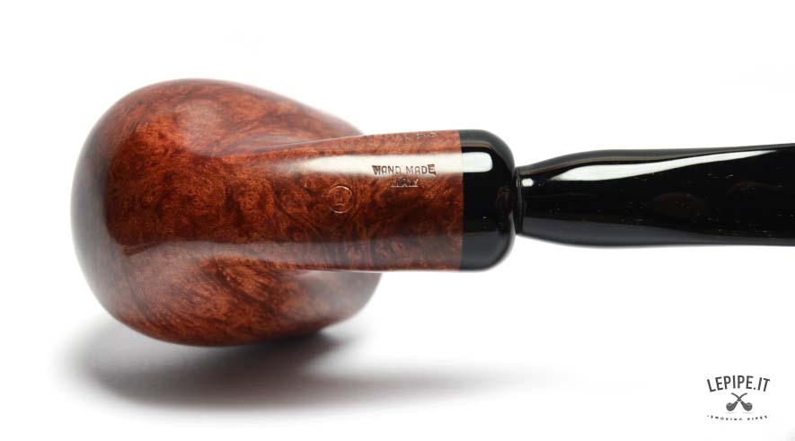 La radica liscia è valorizzata da una finitura calda e profonda, che esalta una venatura fitta e dinamica, capace di catturare la luce e restituire sfumature ricche e naturali. Il fornello, alto e ben sviluppato, domina la scena con eleganza e solidità.