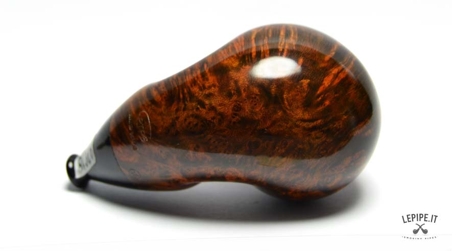 La finitura liscia esalta una radica particolarmente vivace, con venature fitte e contrastate che si sviluppano in profondità su tutta la superficie, regalando riflessi caldi e dinamici. Il corpo della pipa appare pieno e armonioso, con raccordi fluidi che accompagnano naturalmente verso il bocchino.