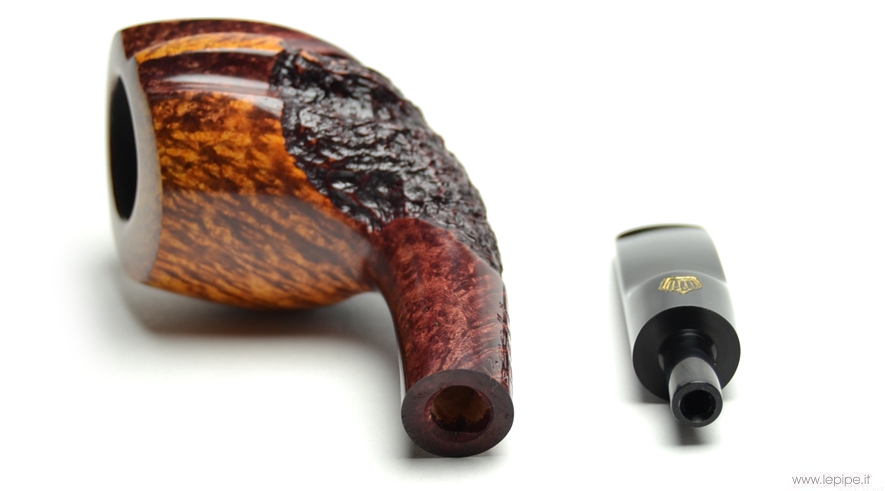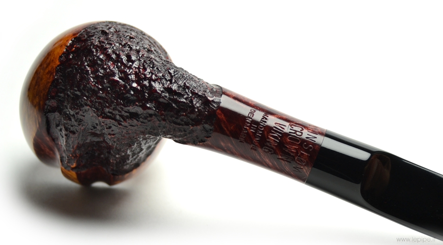 Pipa Crown Viking n. 18  Bocchino in metacrilato Senza filtro Semi rusticata Senza elaborazione Diametro Interno: 21 mm. Diametro Esterno: 43 mm. Lunghezza: 133 mm. Altezza: 49 mm. Peso: 49 gr. Profondità: 40 mm.