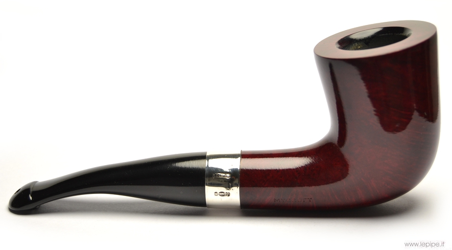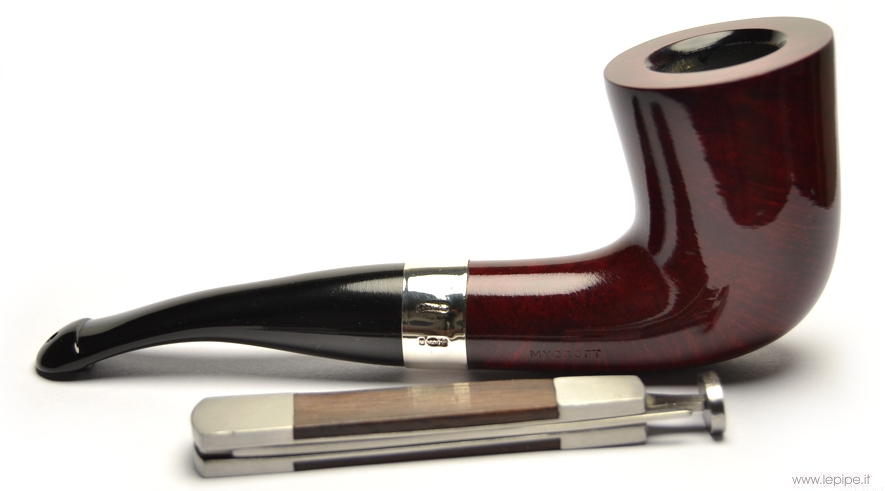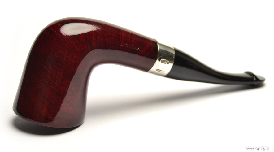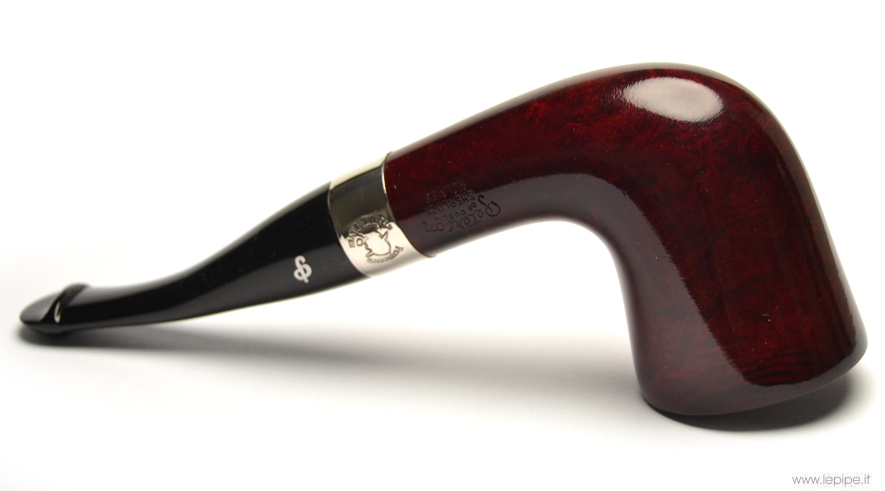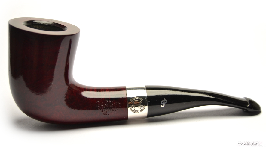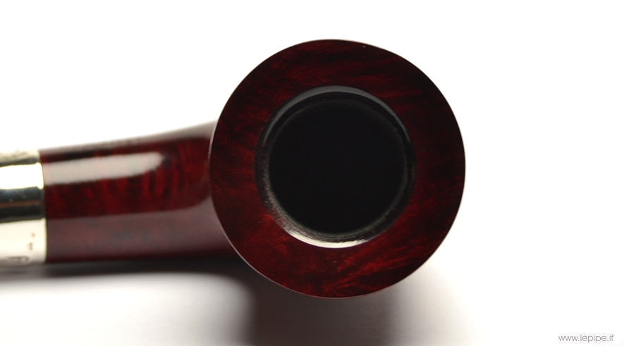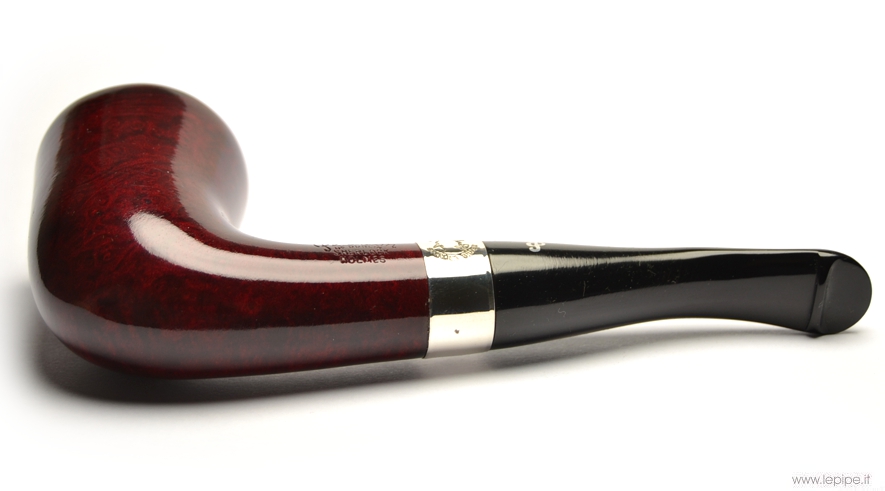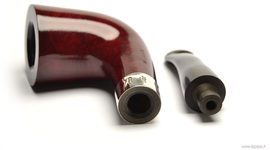 Pipa Peterson - S.H. Dark Red n. 21 Mycroft Bocchino in ebanite Senza filtro Liscia Con elaborazione in argento Diametro Interno: 21 mm. Diametro Esterno: 39 mm. Lunghezza: 143 mm. Altezza: 54 mm. Peso: 53 gr. Profondità: 44 mm.