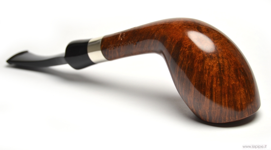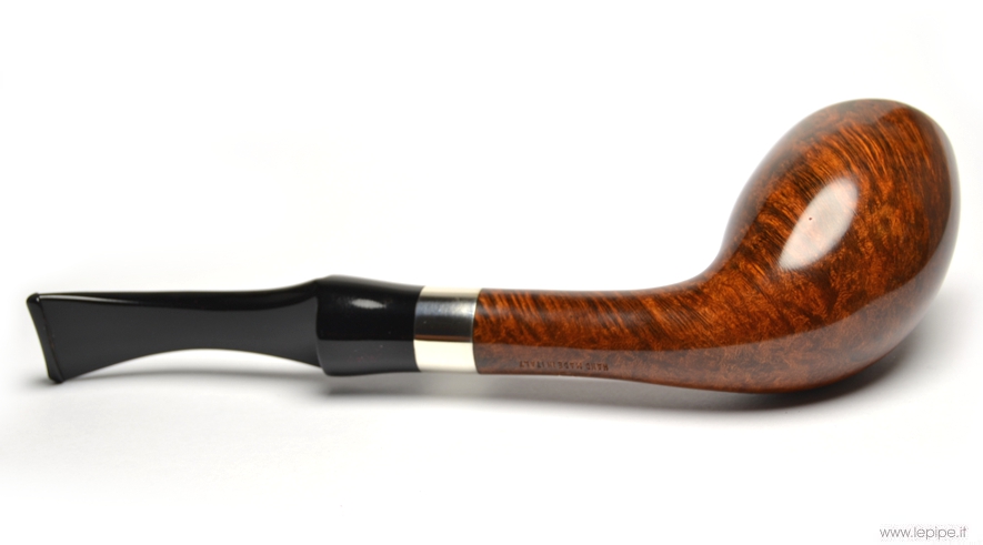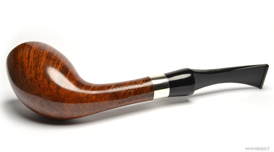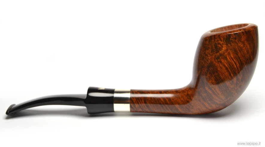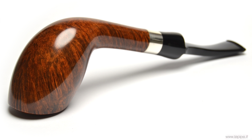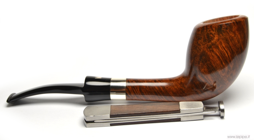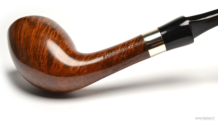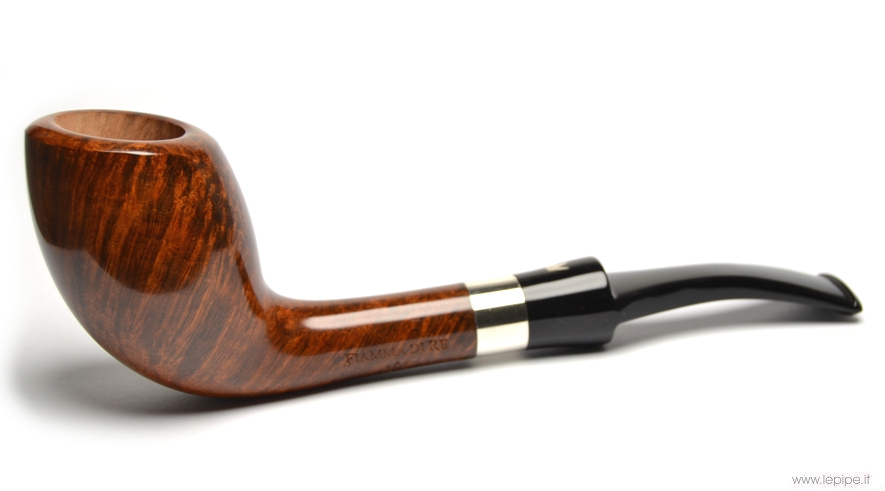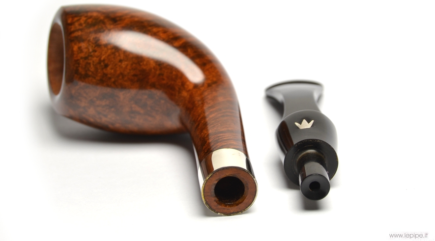 Pipa Fiamma di Re - 1 Corona n. 05  Bocchino in metacrilato Senza filtro Liscia Con elaborazione in argento Diametro Interno: 20 mm. Diametro Esterno: 39 mm. Lunghezza: 165 mm. Altezza: 52 mm. Peso: 47 gr. Profondità: 40 mm.