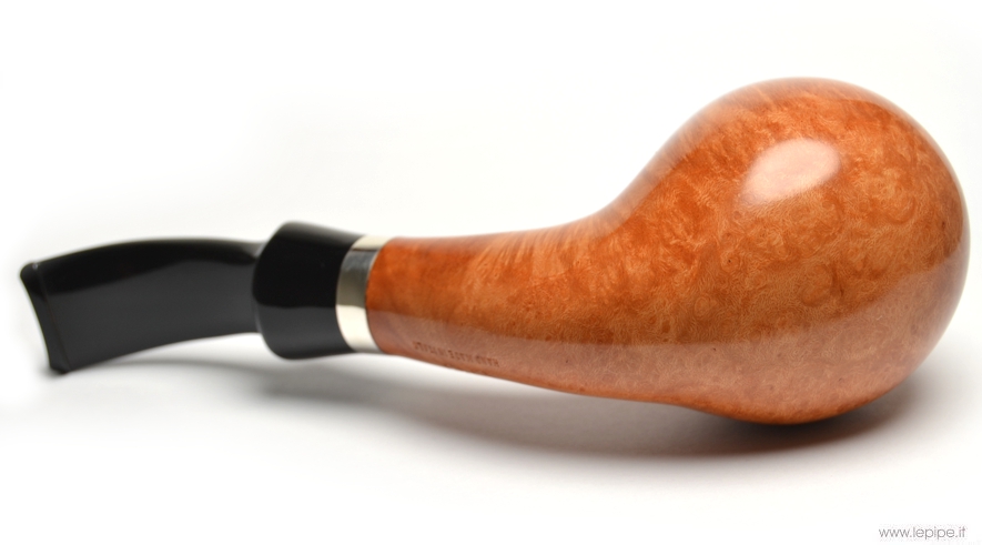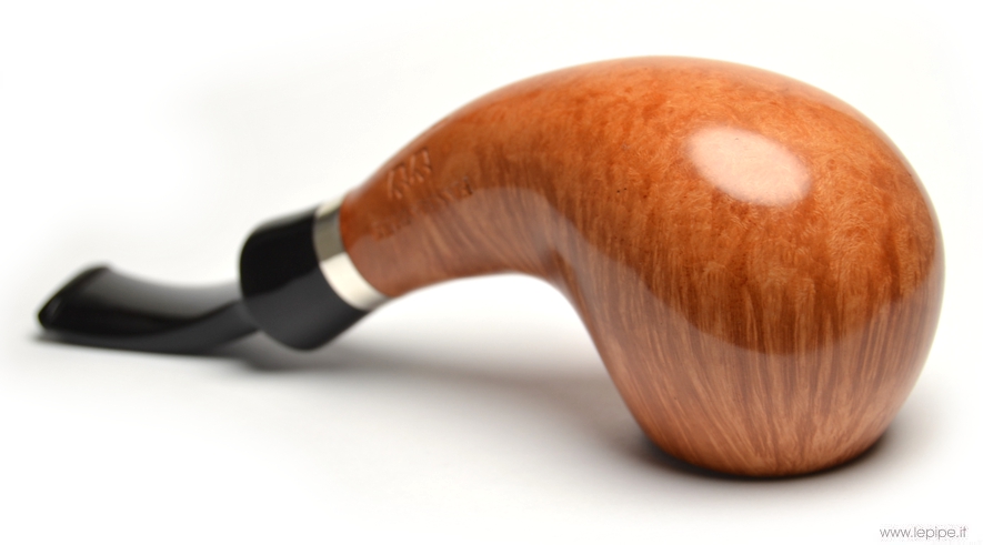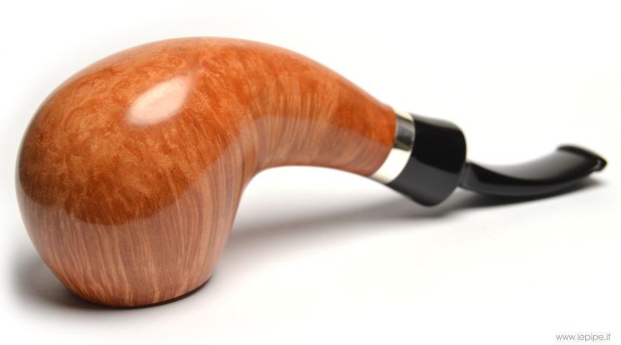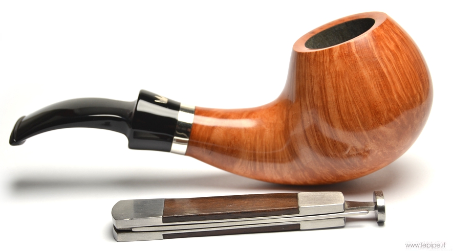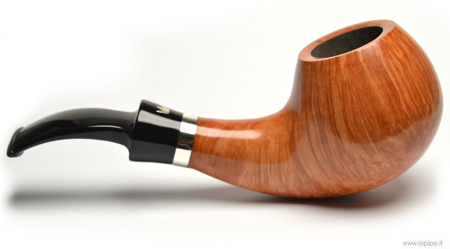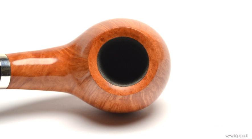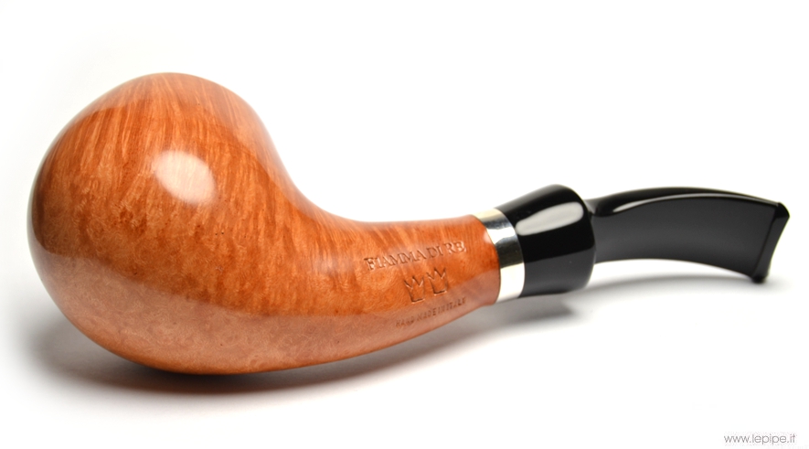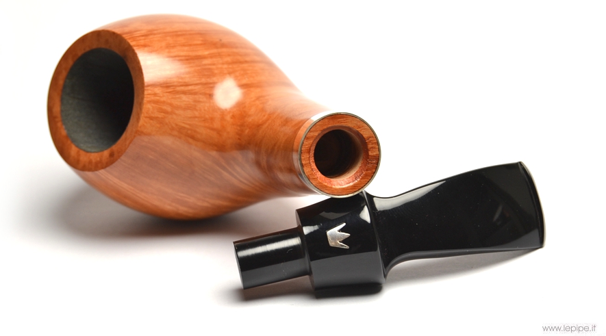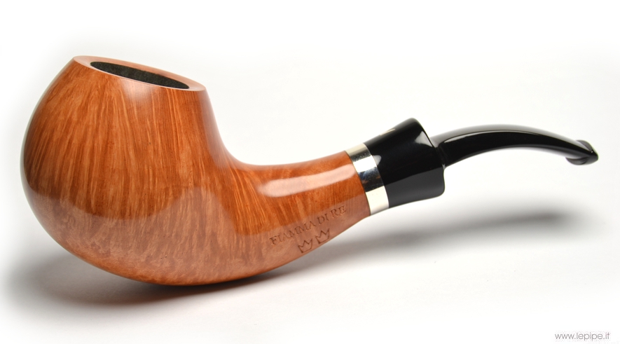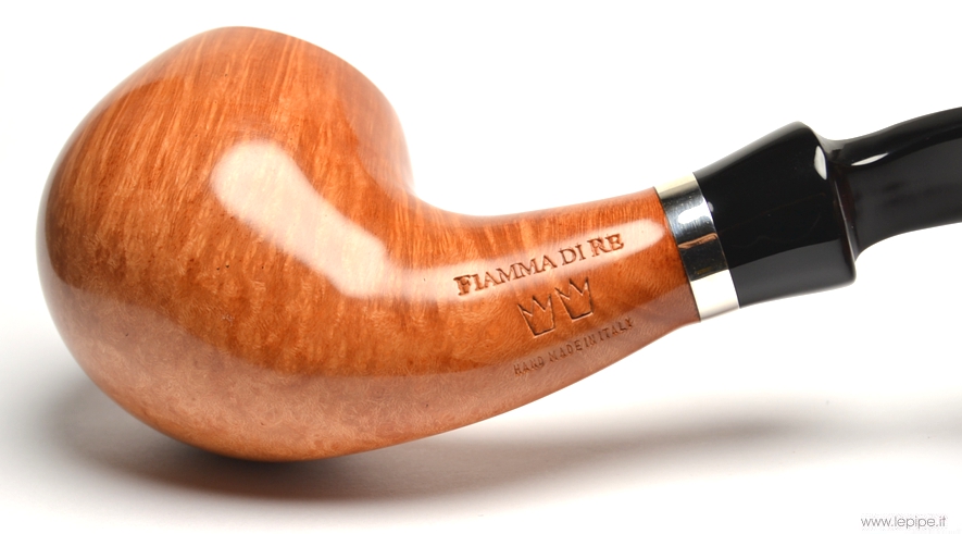 Pipa Fiamma di Re - 2 Corone n. 05  Bocchino in metacrilato Senza filtro Liscia Con elaborazione in argento Diametro Interno: 22 mm. Diametro Esterno: 47 mm. Lunghezza: 142 mm. Altezza: 48 mm. Peso: 71 gr. Profondità: 38 mm.