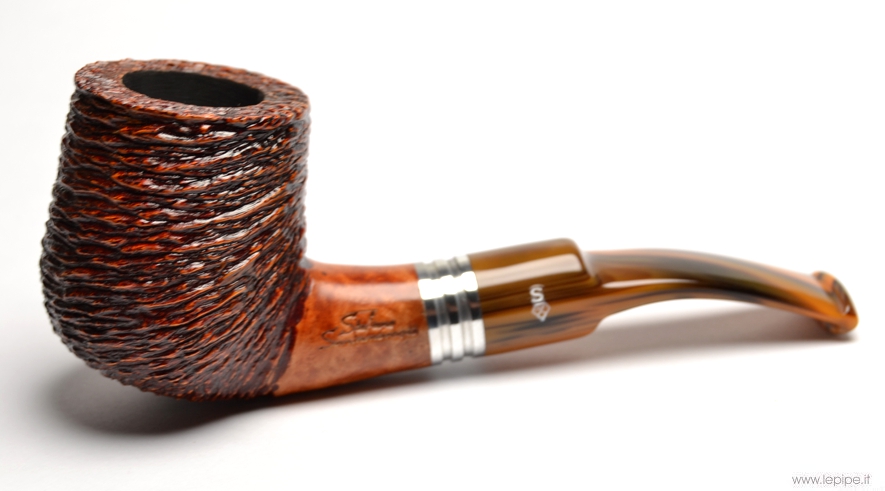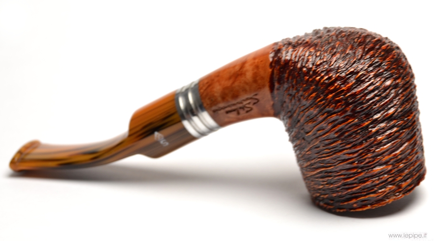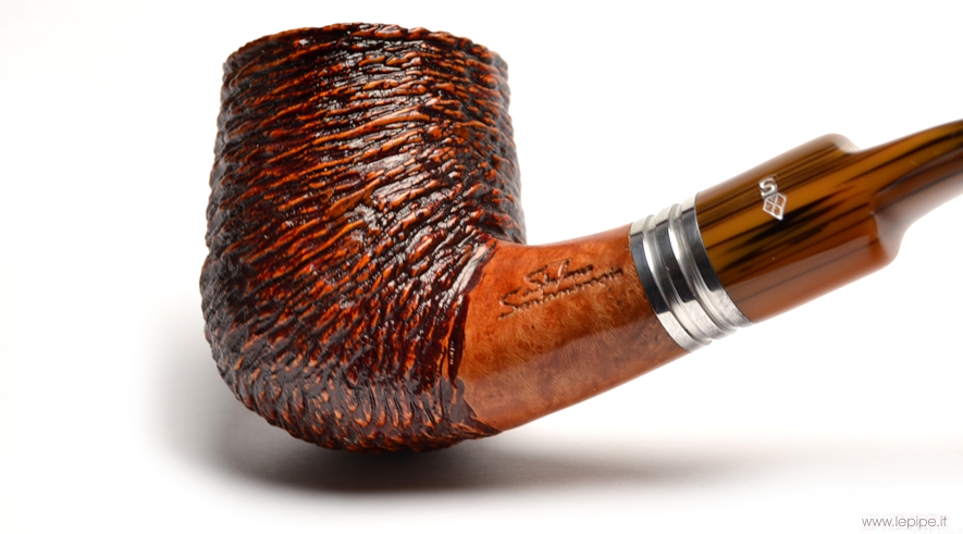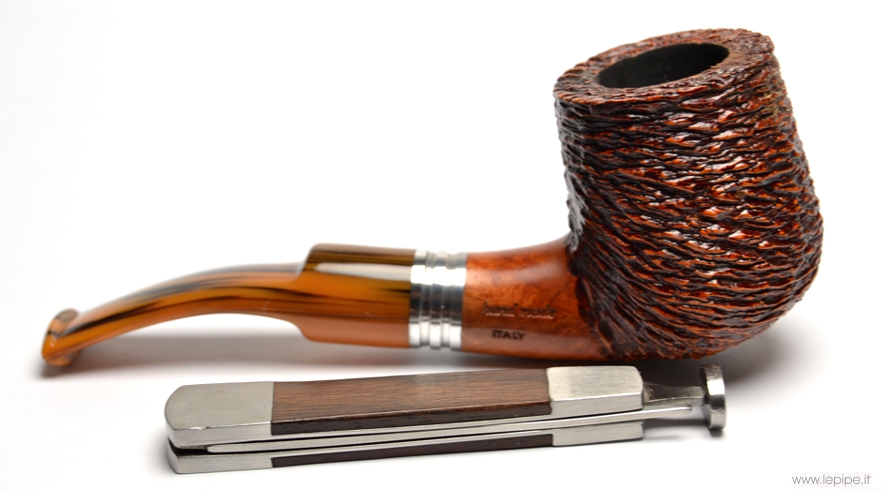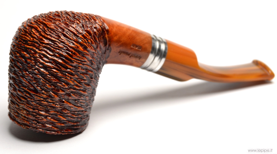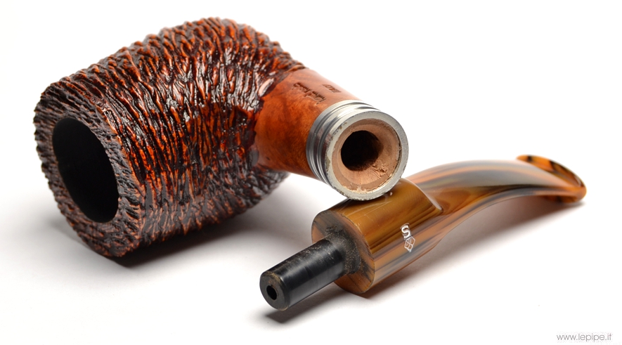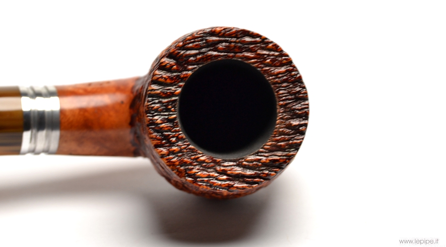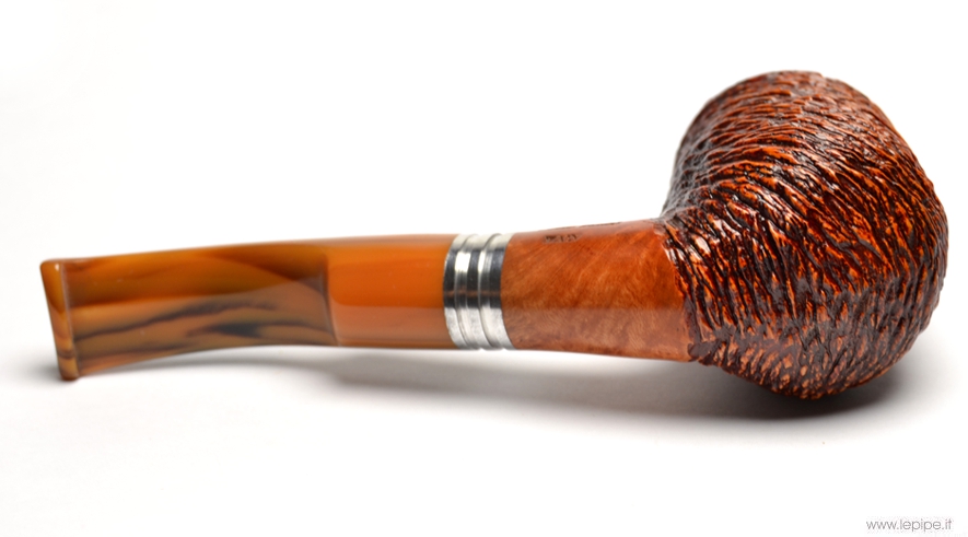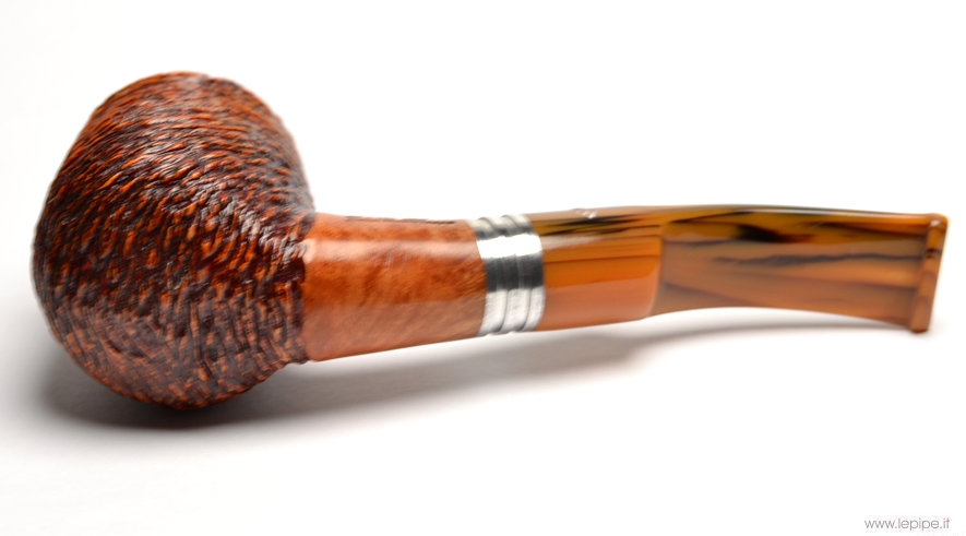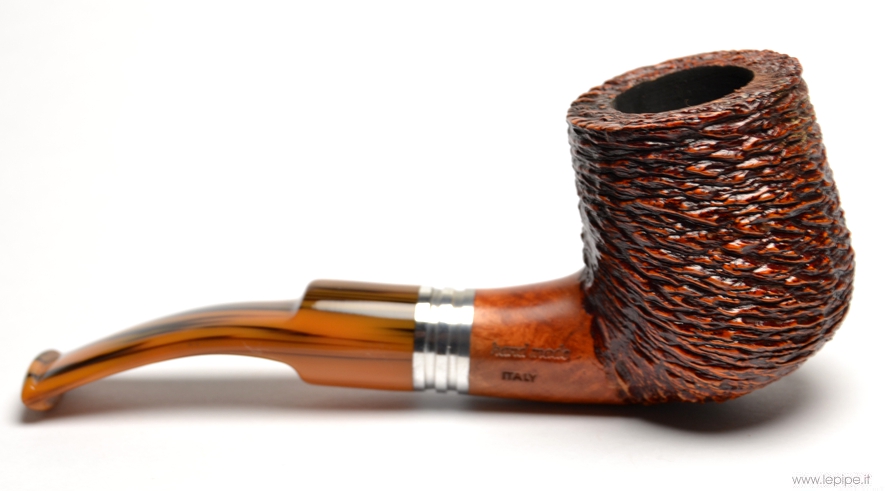 Pipa Santambrogio - Rusticata n. 120 Grande Bocchino in metacrilato Senza filtro Rusticata Con elaborazione in argento Diametro Interno: 20 mm. Diametro Esterno: 40 mm. Lunghezza: 131 mm. Altezza: 46 mm. Peso: 46 gr. Profondità: 39 mm.