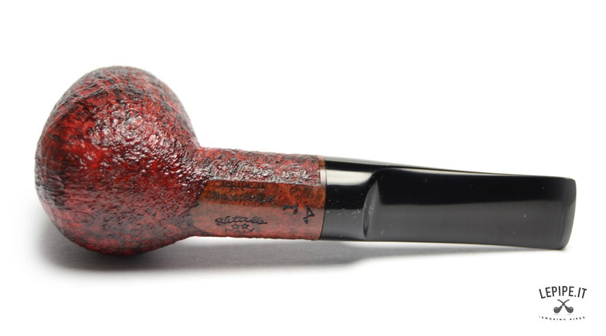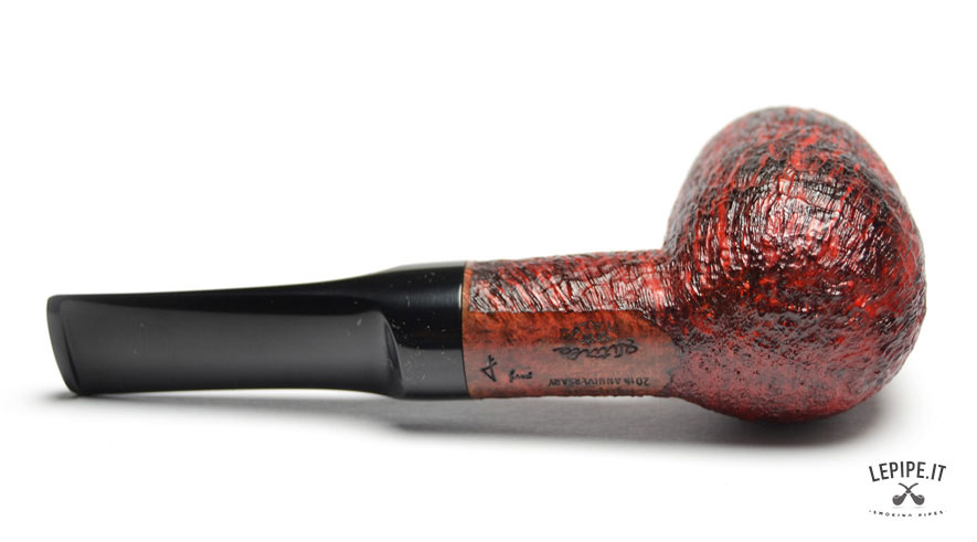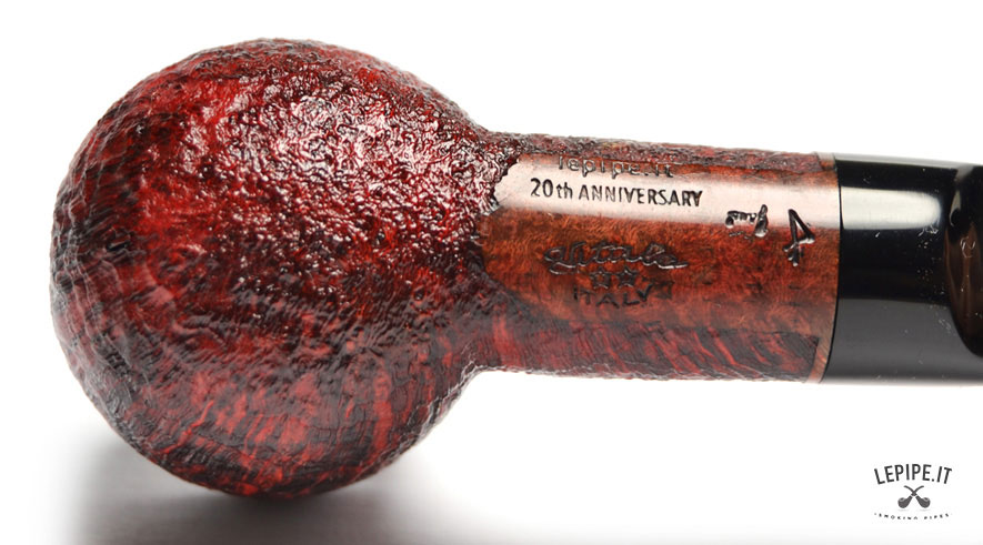Pipa Vitale Ganci - 20° Ann. lepipe.it n. 7  Bocchino in ebanite Senza filtro Sabbiata Senza elaborazione Diametro Interno: 19 mm. Diametro Esterno: 36 mm. Lunghezza: 119 mm. Altezza: 46 mm. Peso: 40 gr. Profondità: 37 mm.