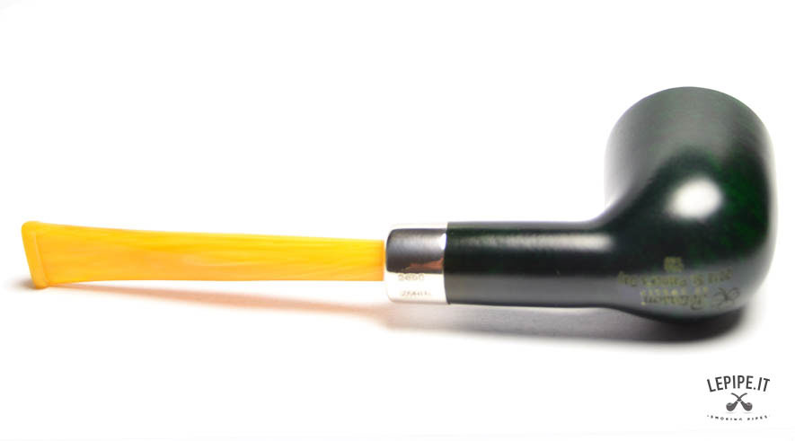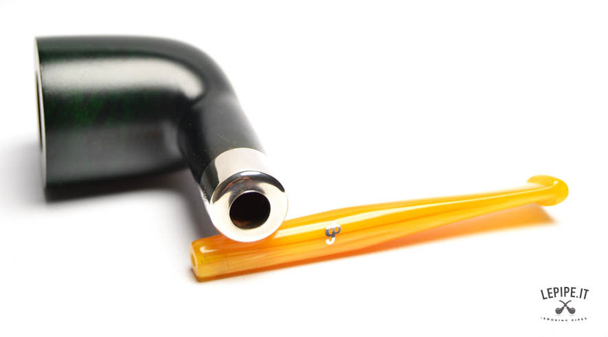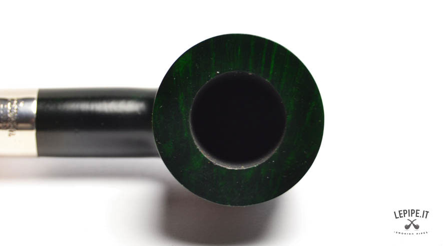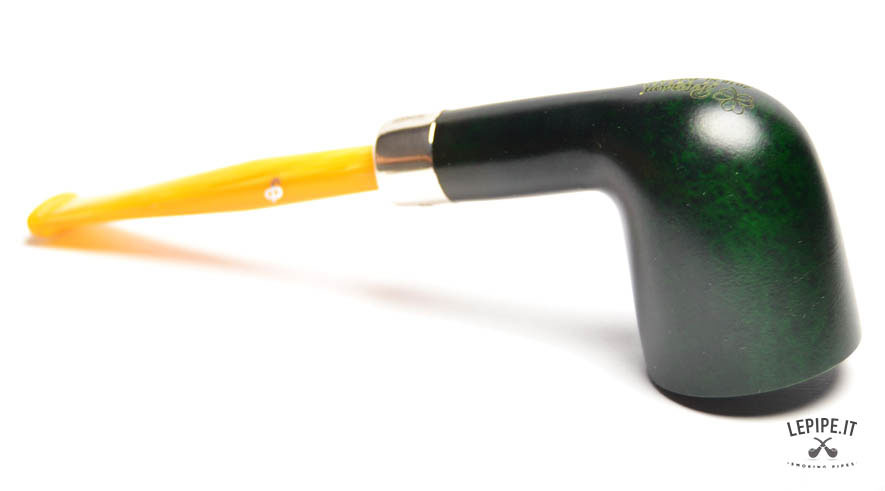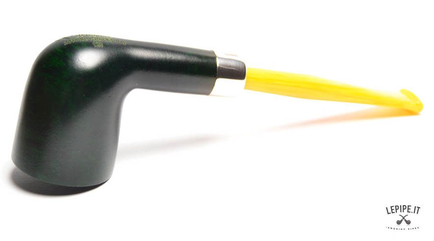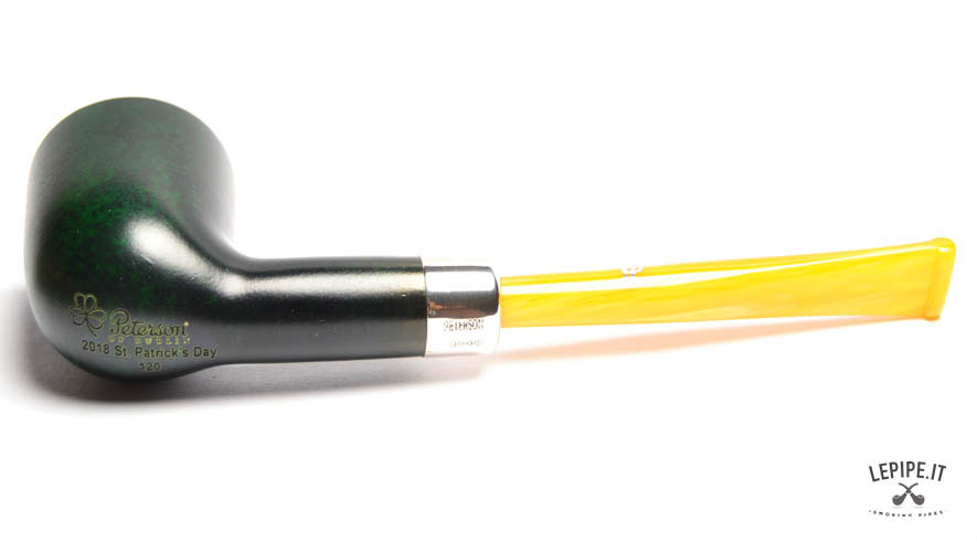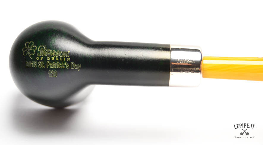 Pipa Peterson - St Patricks Day 2018 n. 19 120 - <a href=Perch Bocchino in metacrilato Senza filtro Liscia Con elaborazione in argento Diametro Interno: 20 mm. Diametro Esterno: 36 mm. Lunghezza: 156 mm. Altezza: 47 mm. Peso: 40 gr. Profondità: 42 mm.">