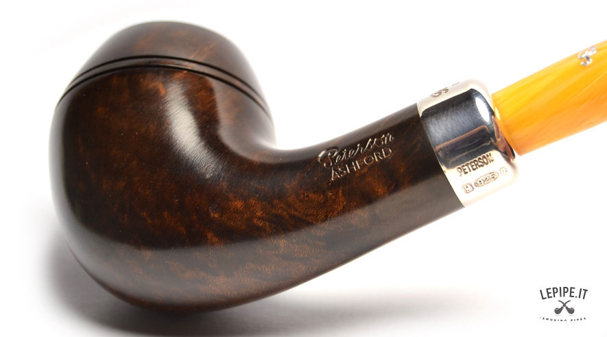 Pipa Peterson - Ashford Army n. 25 XL14 Bocchino in metacrilato Senza filtro Liscia Con elaborazione in argento Diametro Interno: 21 mm. Diametro Esterno: 44 mm. Lunghezza: 156 mm. Altezza: 56 mm. Peso: 65 gr. Profondità: 38 mm.