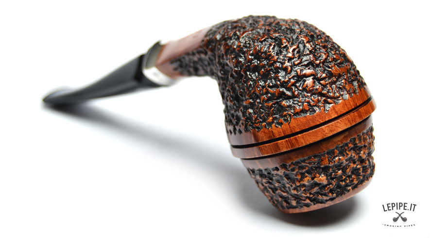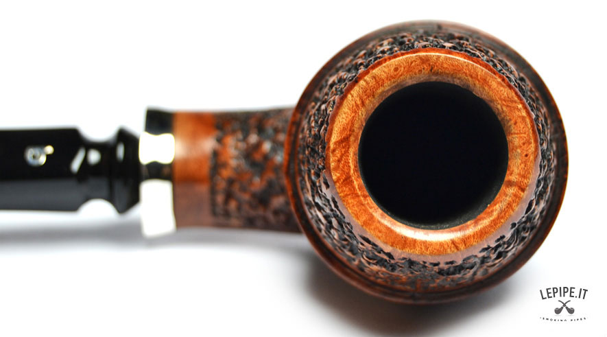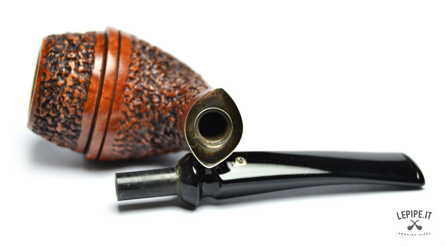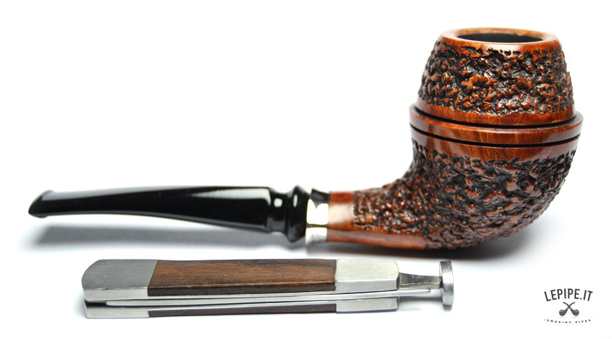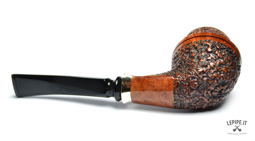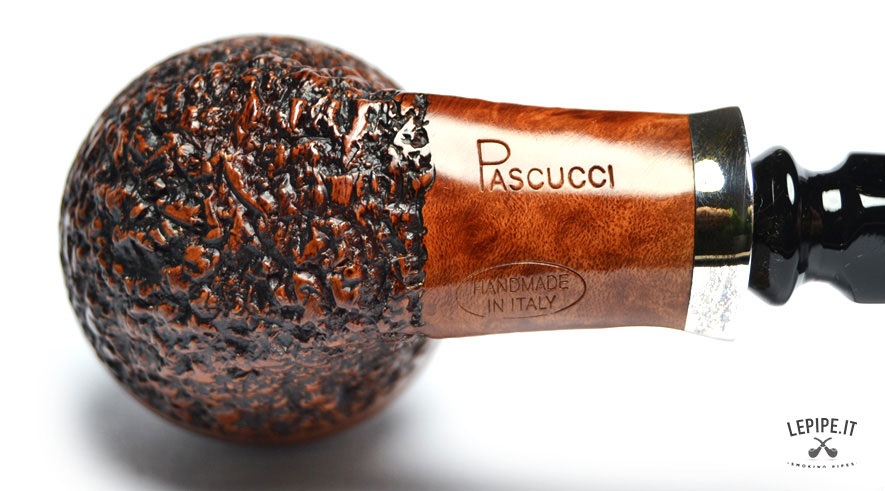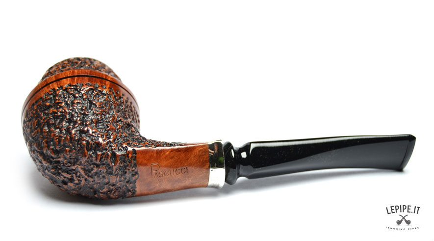 Pipa Pascucci - Rusticata n. 107  Bocchino in metacrilato Senza filtro Rusticata Con elaborazione in argento Diametro Interno: 20 mm. Diametro Esterno: 43 mm. Lunghezza: 142 mm. Altezza: 52 mm. Peso: 52 gr. Profondità: 44 mm.