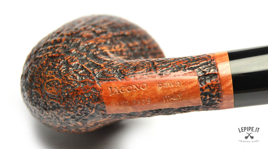 Pipa Jacono - Pawn n. 13  Bocchino in metacrilato Senza filtro Sabbiata Senza elaborazione Diametro Interno: 19 mm. Diametro Esterno: 37 mm. Lunghezza: 139 mm. Altezza: 46 mm. Peso: 43 gr. Profondità: 36 mm.
