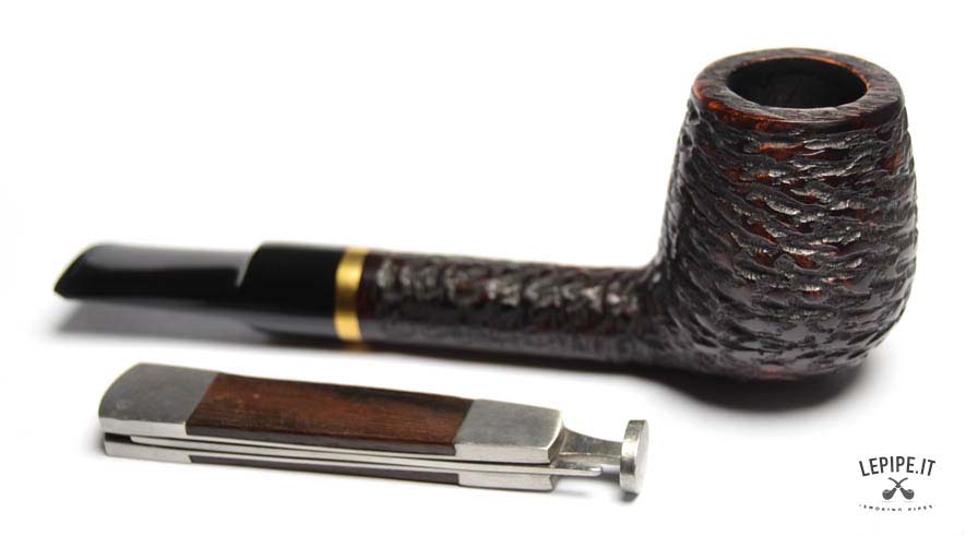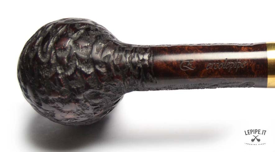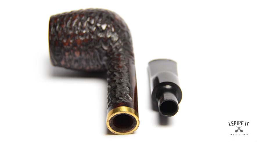 Pipa Bogni - Rusticata n. 138  Bocchino in metacrilato Con sede per filtro da 9 mm. Rusticata Con altra elaborazione Diametro Interno: 20 mm. Diametro Esterno: 40 mm. Lunghezza: 145 mm. Altezza: 48 mm. Peso: 48 gr. Profondità: 43 mm.