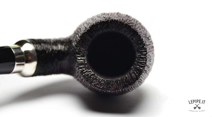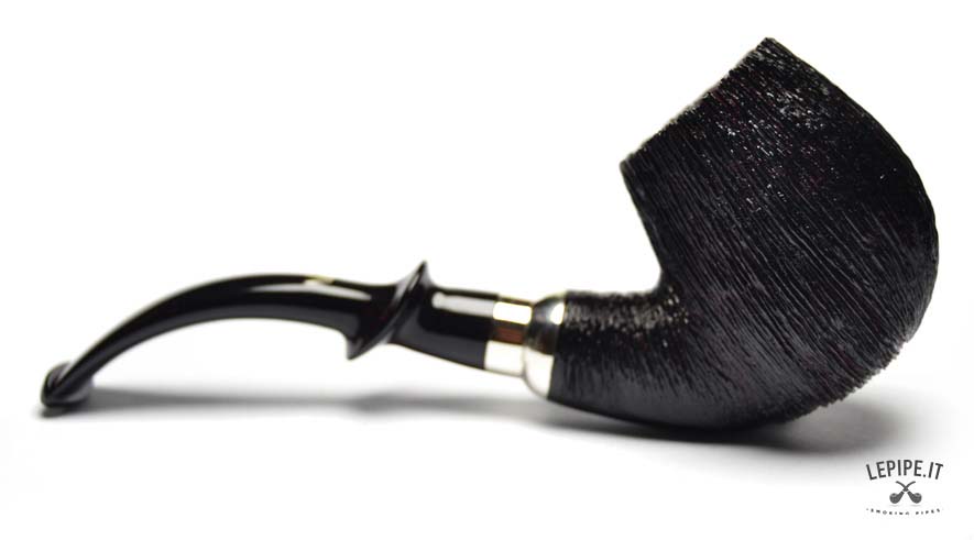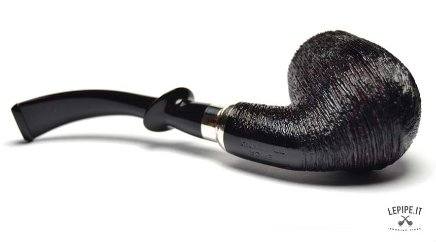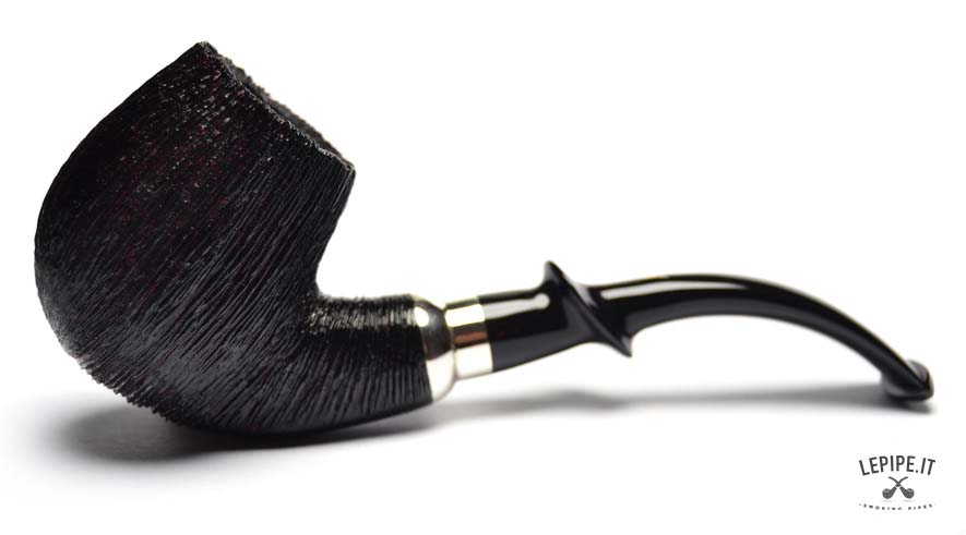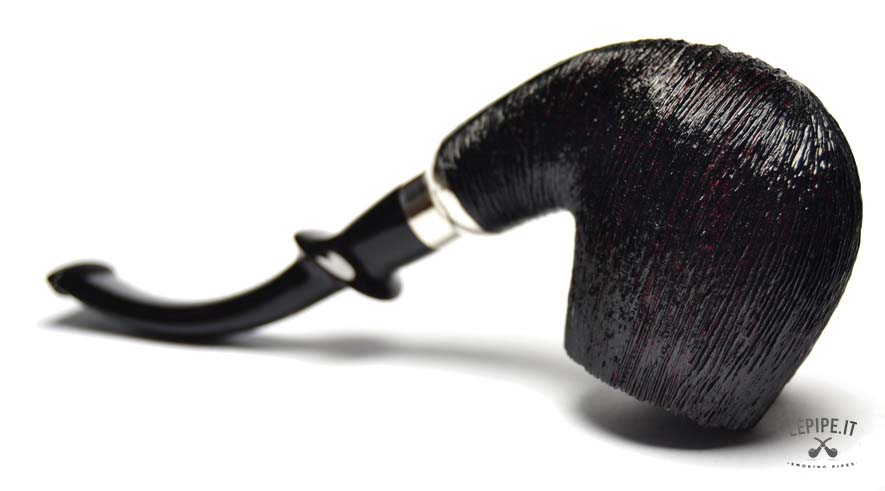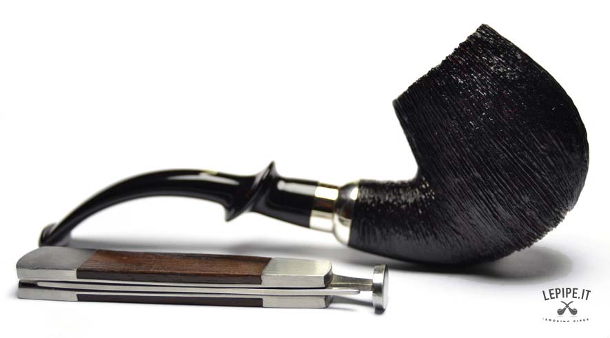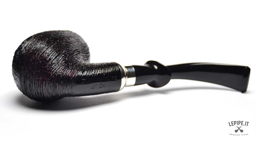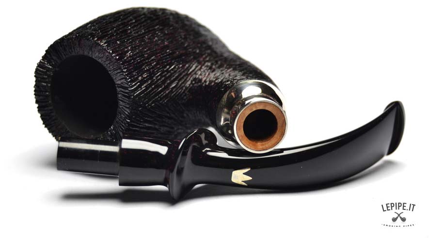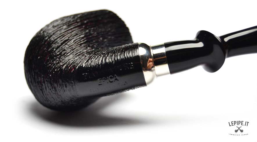 Pipa Fiamma di Re - Epica n. 18  Bocchino in metacrilato Senza filtro Rusticata Con elaborazione in argento Diametro Interno: 20 mm. Diametro Esterno: 38 mm. Lunghezza: 140 mm. Altezza: 48 mm. Peso: 48 gr. Profondità: 38 mm.