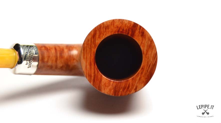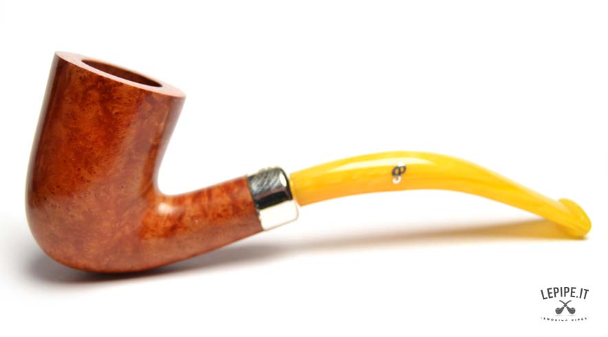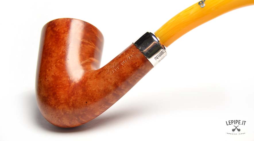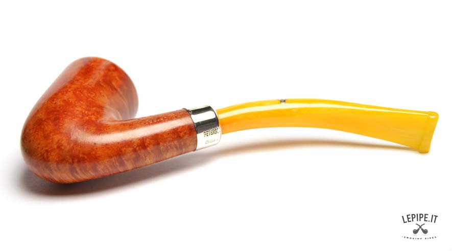 Pipa Peterson - Kapp Royal Silver n. 32  Bocchino in metacrilato Senza filtro Liscia Con elaborazione in argento Diametro Interno: 19 mm. Diametro Esterno: 31 mm. Lunghezza: 136 mm. Altezza: 47 mm. Peso: 31 gr. Profondità: 38 mm.