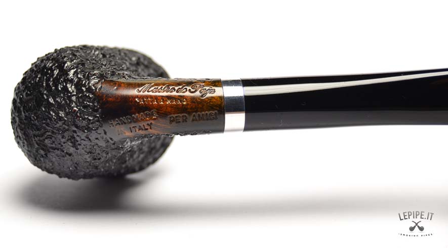 Pipa Mastro de Paja - Rusticata n. 40  Bocchino in metacrilato Senza filtro Rusticata Con altra elaborazione Diametro Interno: 20 mm. Diametro Esterno: 35 mm. Lunghezza: 131 mm. Altezza: 41 mm. Peso: 34 gr. Profondità: 31 mm.