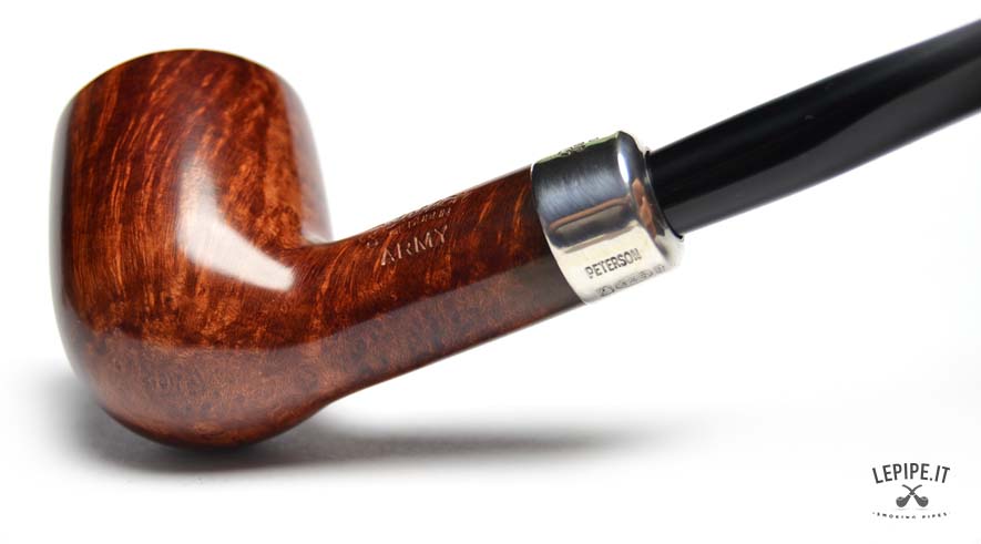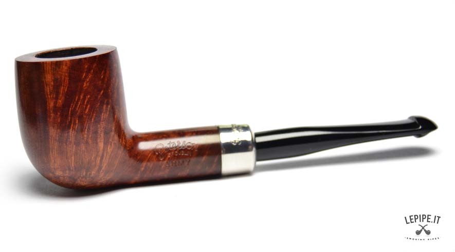 Pipa Peterson - Army n. 24 Mod 101 PL Bocchino in metacrilato Senza filtro Liscia Con elaborazione in argento Diametro Interno: 20 mm. Diametro Esterno: 36 mm. Lunghezza: 144 mm. Altezza: 45 mm. Peso: 41 gr. Profondità: 38 mm.