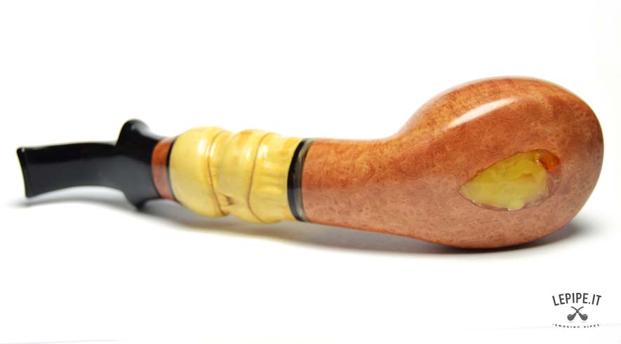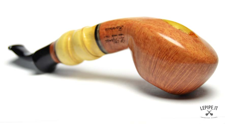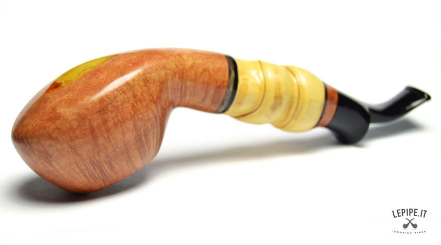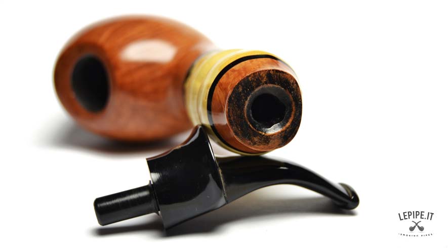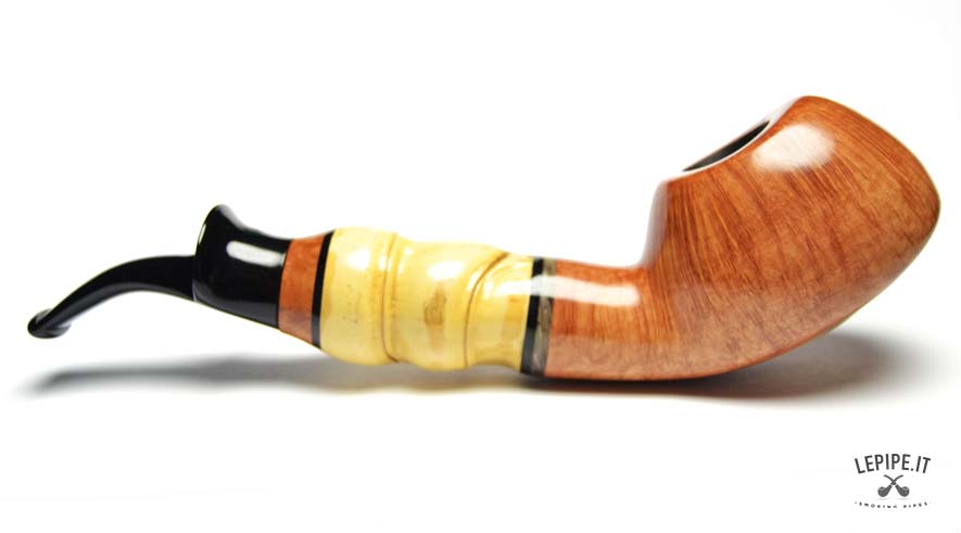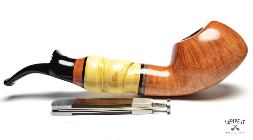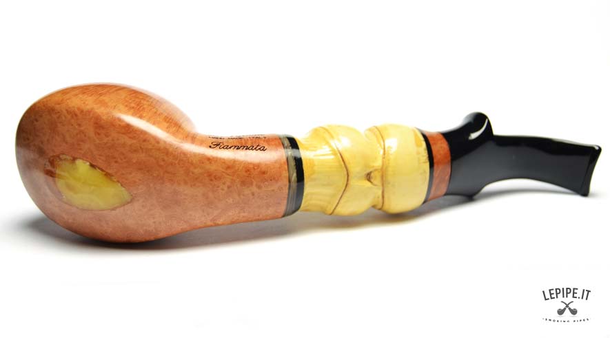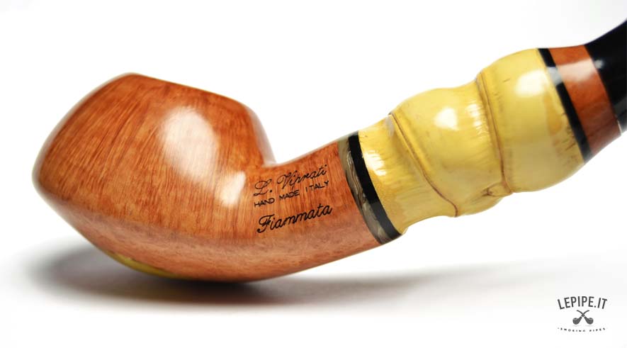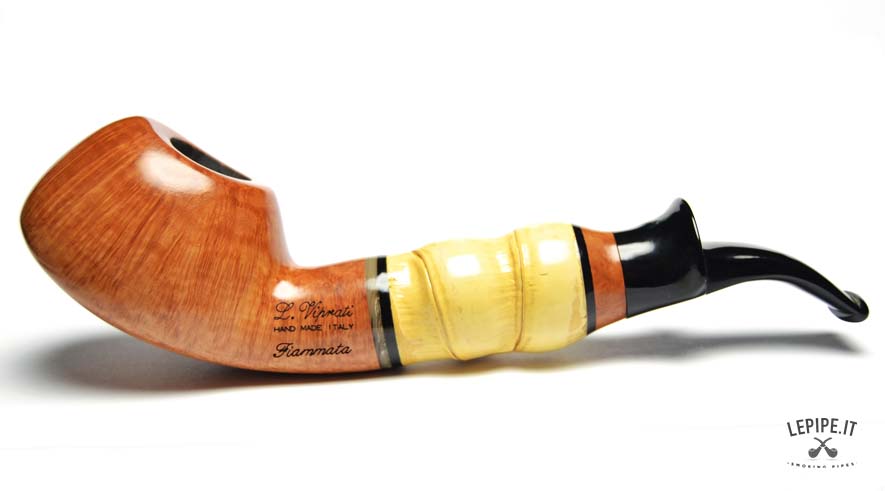 Pipa Viprati - Fiammata n. 5  Bocchino in metacrilato Senza filtro Liscia Con elaborazione in bamboo Diametro Interno: 20 mm. Diametro Esterno: 49 mm. Lunghezza: 190 mm. Altezza: 45 mm. Peso: 118 gr. Profondità: 30 mm.