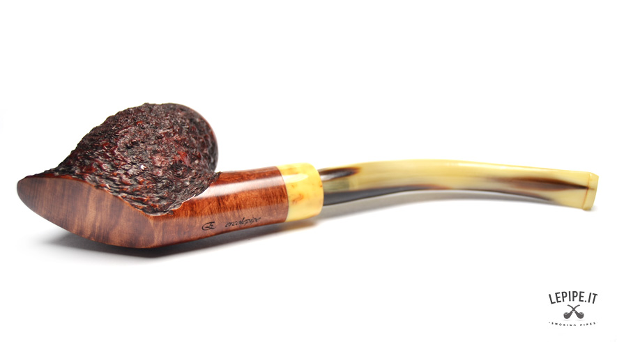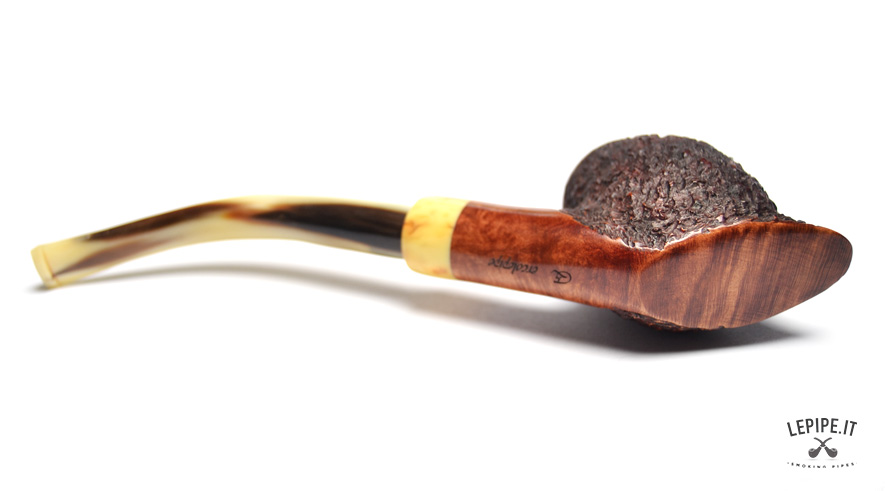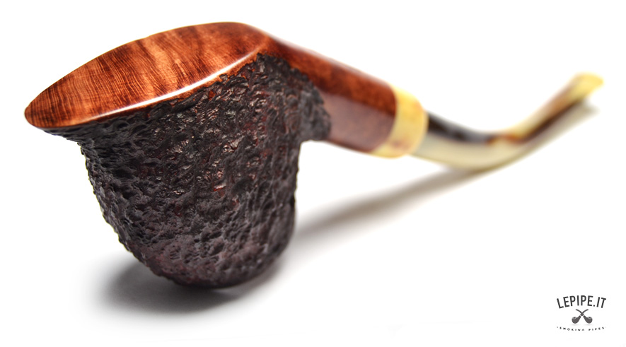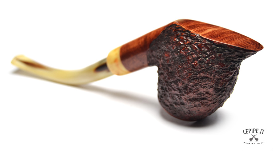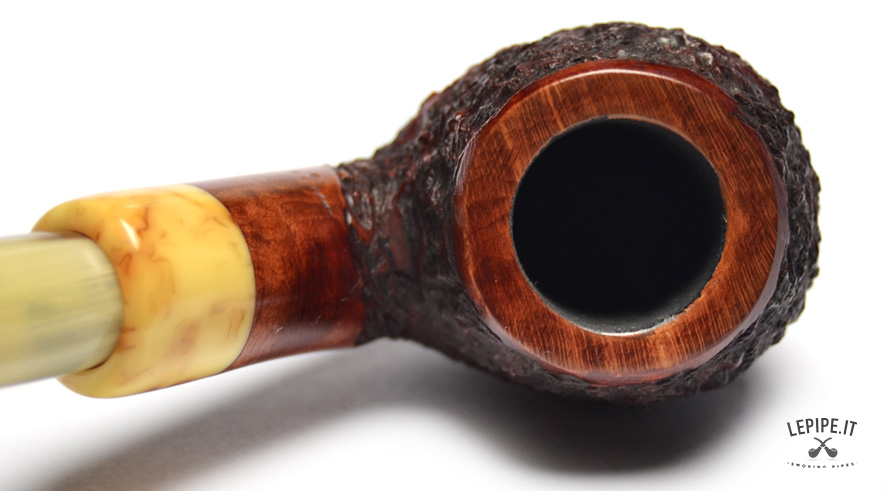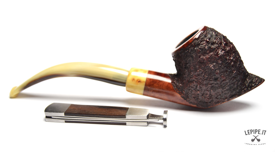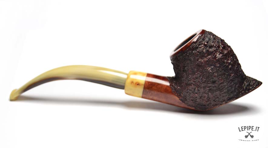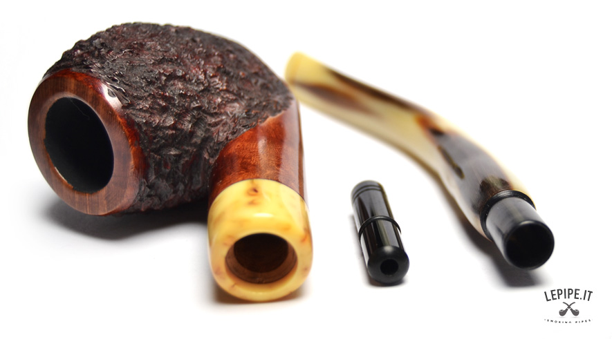 Pipa Bogni - Rusticata n. 170  Bocchino in corno Con sede per filtro da 9 mm. Rusticata Con altra elaborazione Diametro Interno: 20 mm. Diametro Esterno: 40 mm. Lunghezza: 208 mm. Altezza: 58 mm. Peso: 66 gr. Profondità: 44 mm.