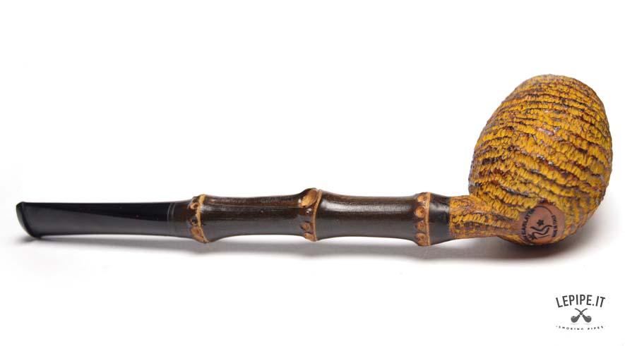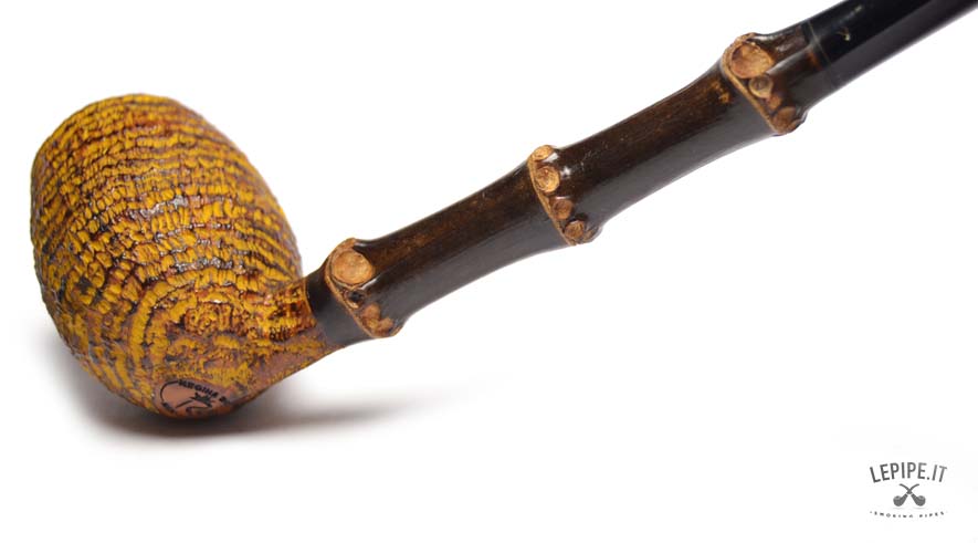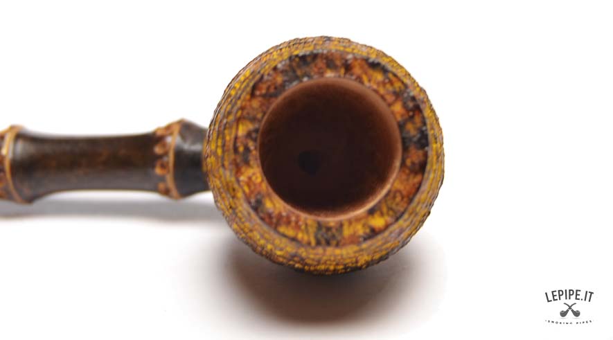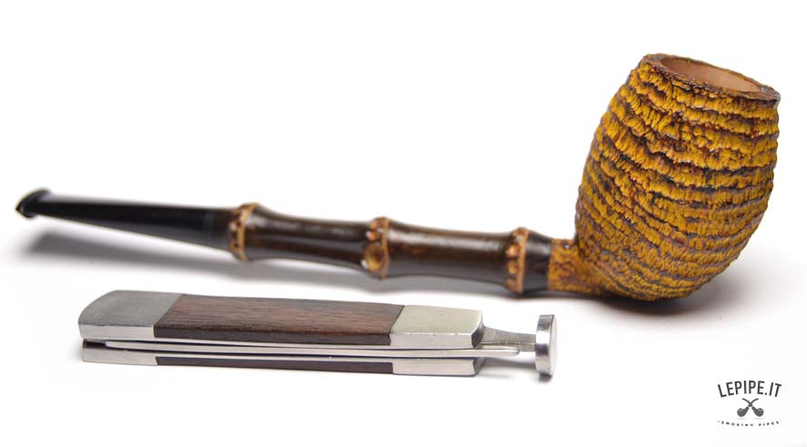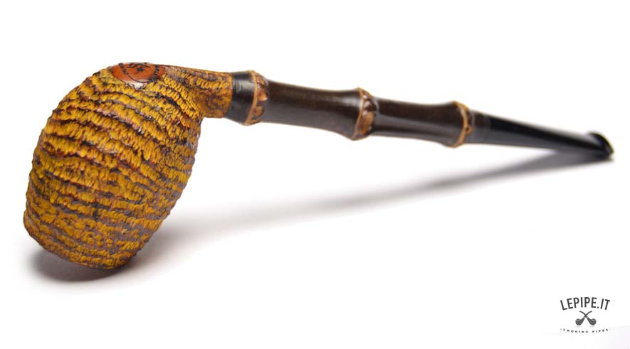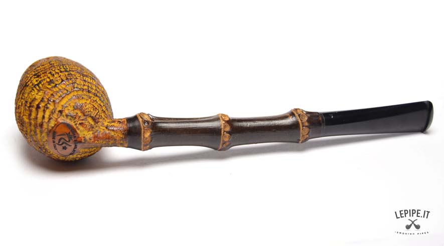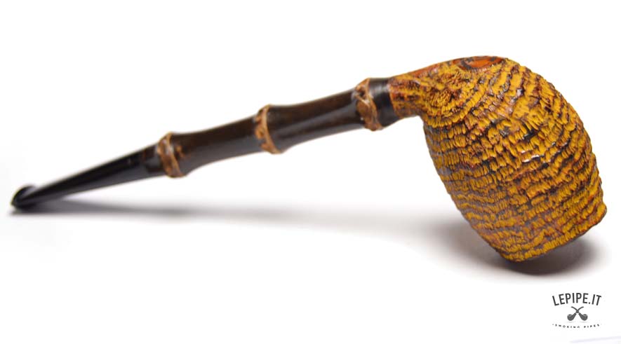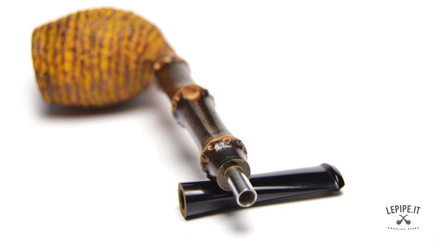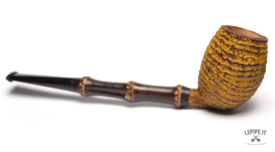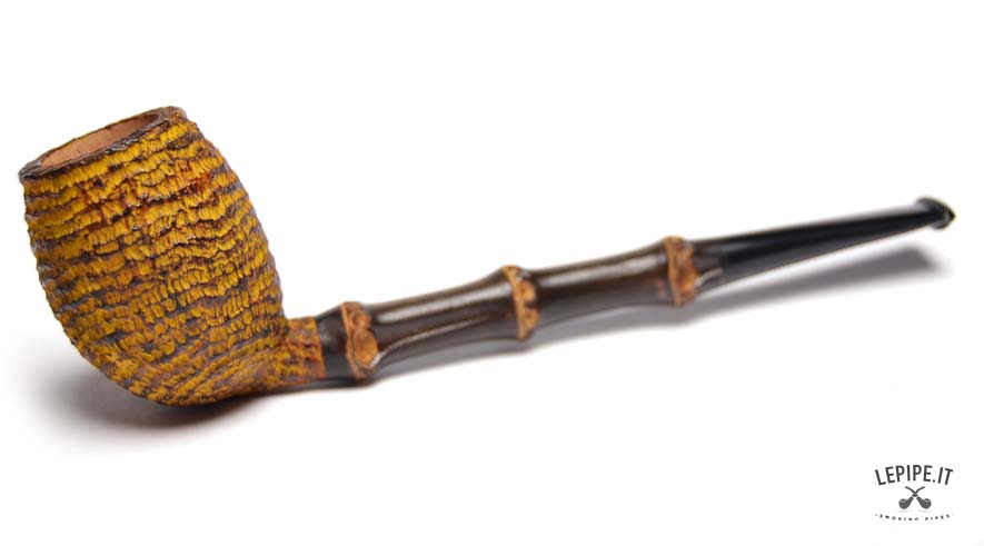 Pipa Regina Scarlatta - n. 86  Bocchino in ebanite Senza filtro Sabbiata Con elaborazione in bamboo Diametro Interno: 18 mm. Diametro Esterno: 34 mm. Lunghezza: 155 mm. Altezza: 47 mm. Peso: 29 gr. Profondità: 35 mm.