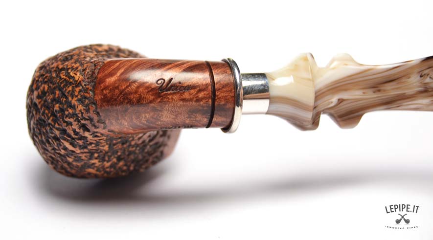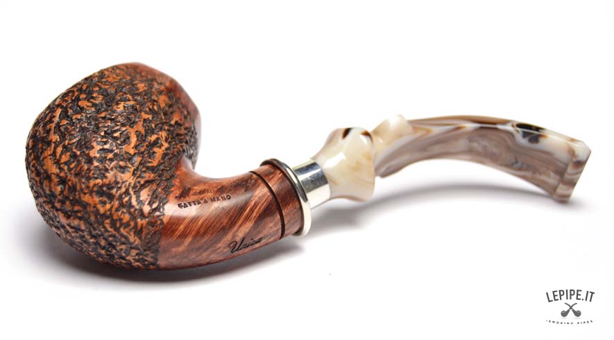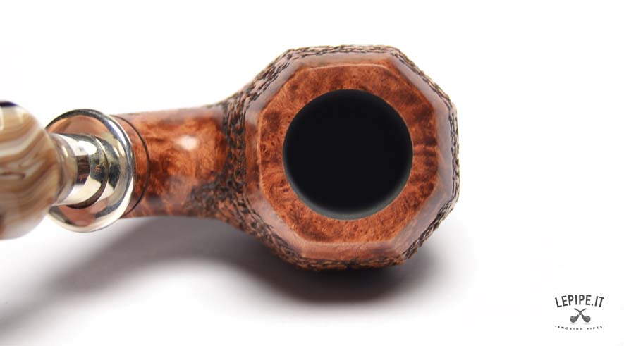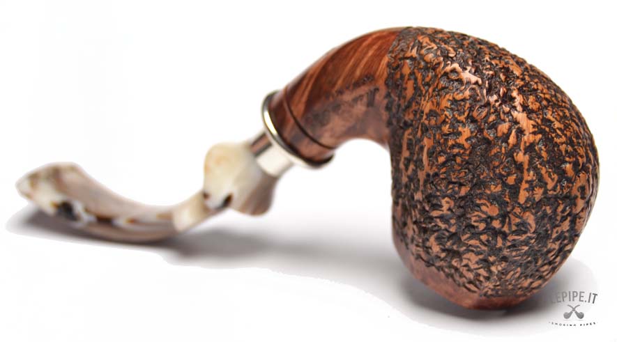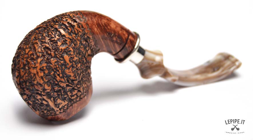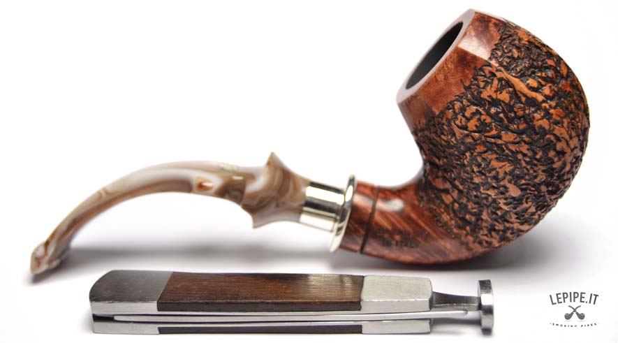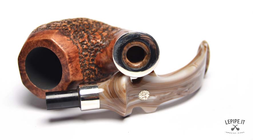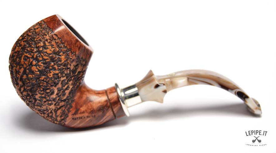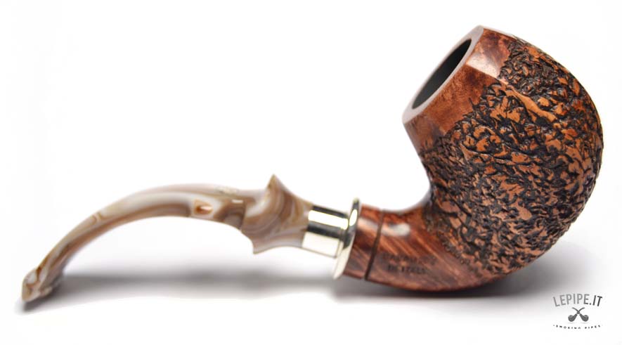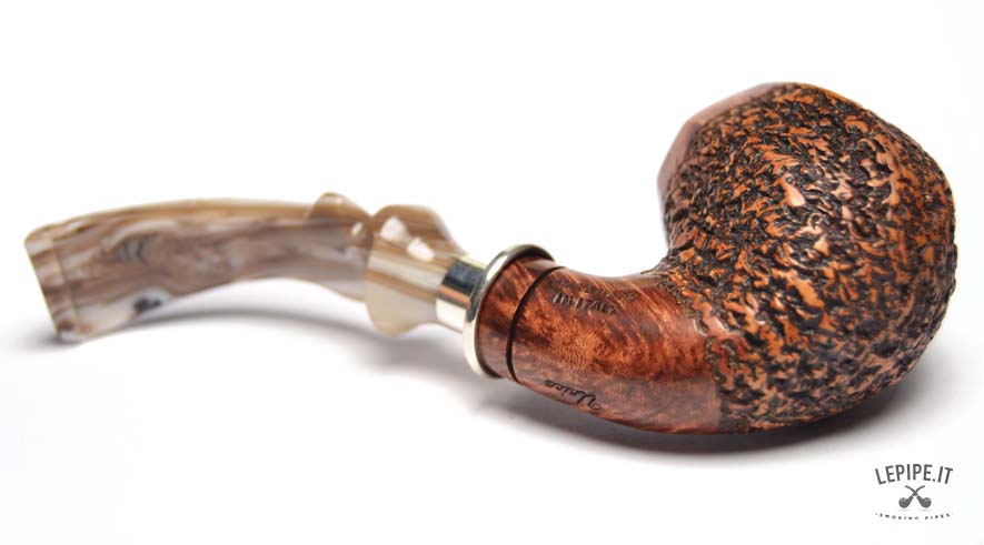 Pipa Mastro de Paja - Sabbiata n. 72 45° Anniversario Bocchino in metacrilato Senza filtro Rusticata Con altra elaborazione Diametro Interno: 20 mm. Diametro Esterno: 37 mm. Lunghezza: 137 mm. Altezza: 45 mm. Peso: 53 gr. Profondità: 33 mm.