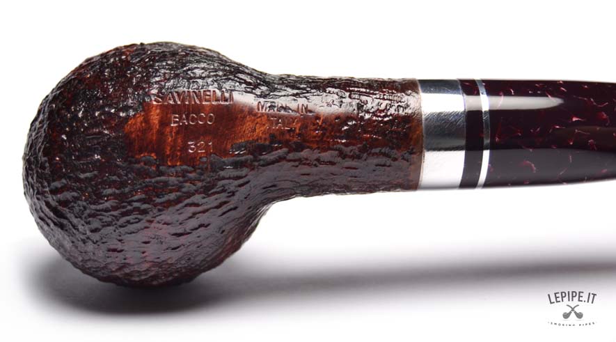 Pipa Savinelli - Bacco n. 1 Mod. 321 Bocchino in metacrilato Con sede per filtro da 6 mm. Rusticata Con altra elaborazione Diametro Interno: 20 mm. Diametro Esterno: 43 mm. Lunghezza: 135 mm. Altezza: 36 mm. Peso: 48 gr. Profondità: 27 mm.