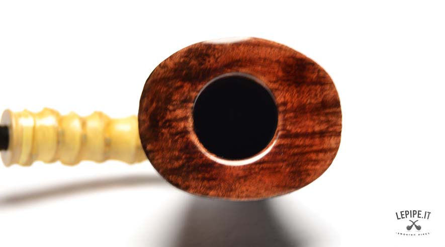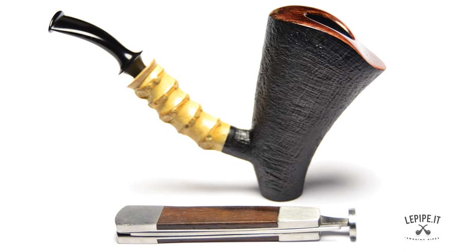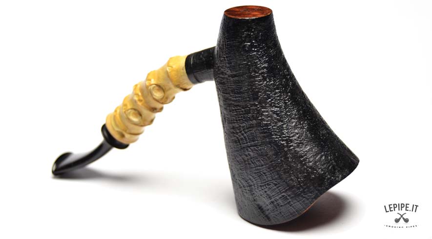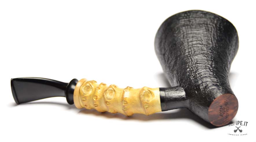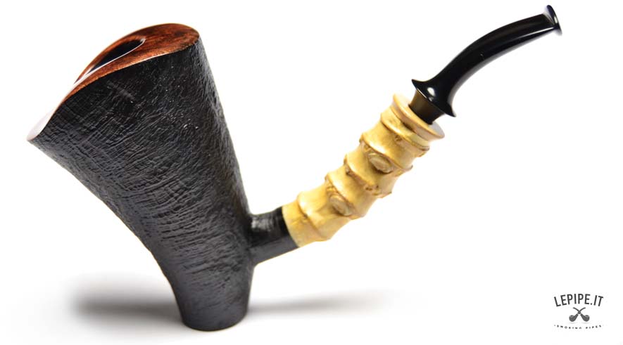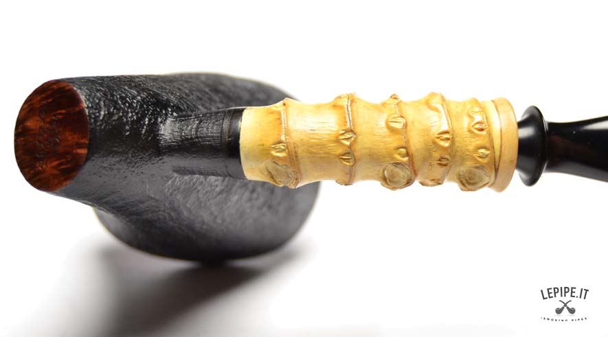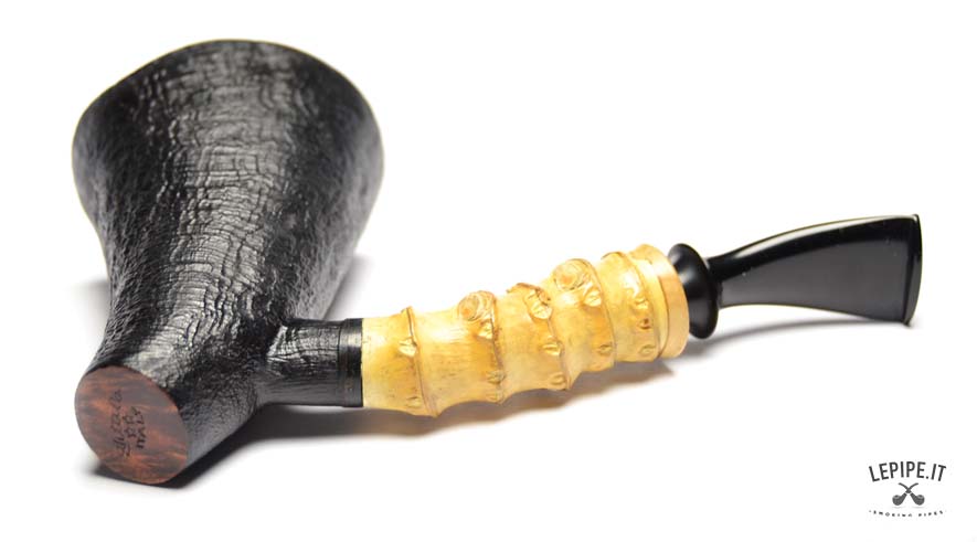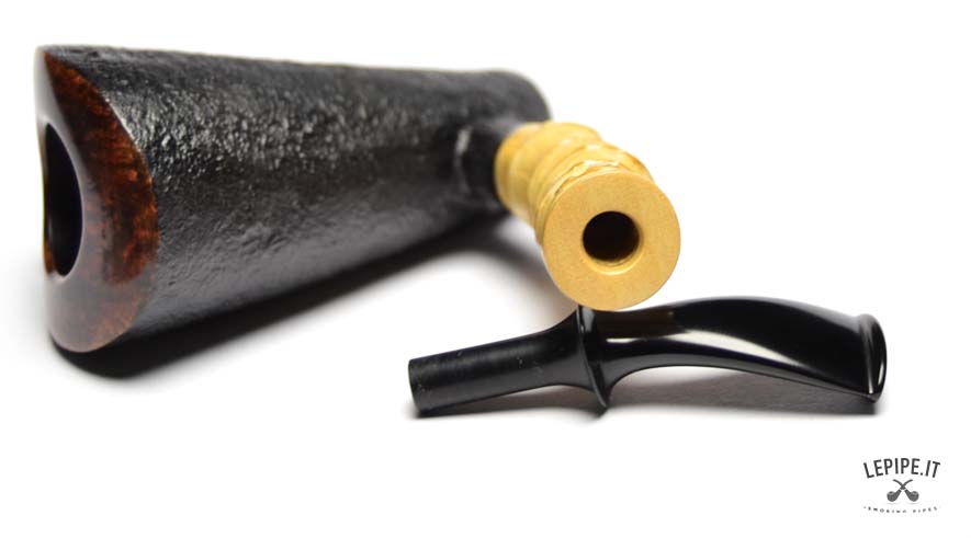 Pipa Vitale - n. 134 Stand-Up Bocchino in ebanite Senza filtro Sabbiata Con elaborazione in bamboo Diametro Interno: 19 mm. Diametro Esterno: 38 mm. Lunghezza: 124 mm. Altezza: 73 mm. Peso: 43 gr. Profondità: 48 mm.