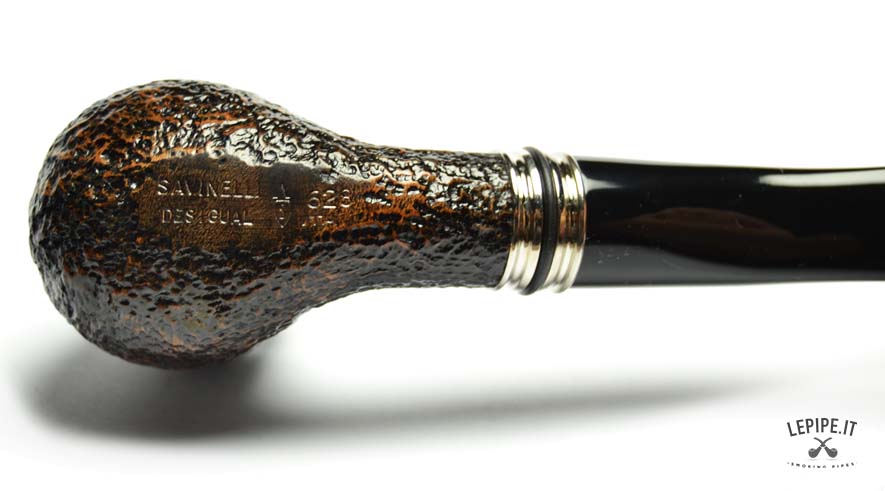 Pipa Savinelli - Desigual n. 21 Mod. 628 - Stand-Up Bocchino in metacrilato Con sede per filtro da 6 mm. Rusticata Con altra elaborazione Diametro Interno: 19 mm. Diametro Esterno: 39 mm. Lunghezza: 139 mm. Altezza: 49 mm. Peso: 65 gr. Profondità: 38 mm.