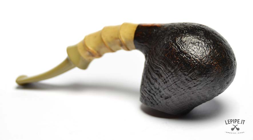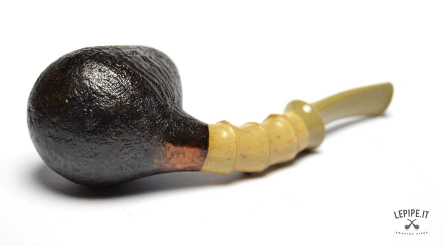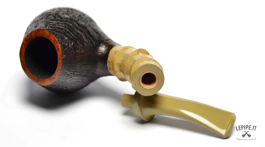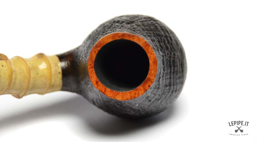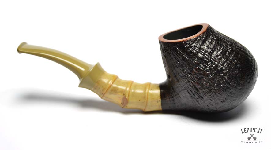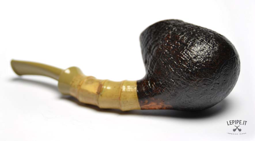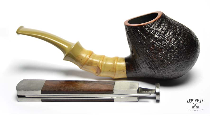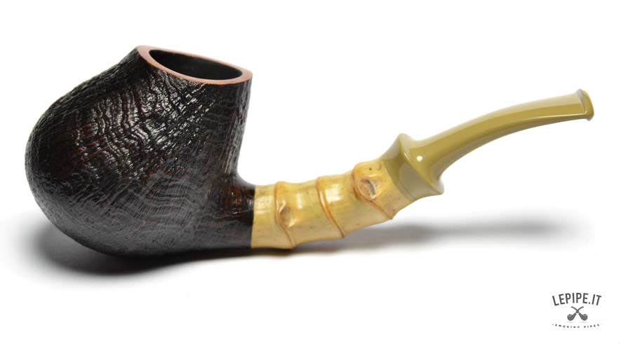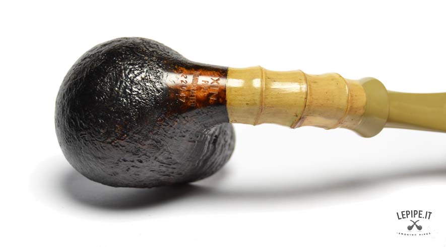 Pipa Xin Li - n. 3  Bocchino in ebanite Senza filtro Sabbiata Con elaborazione in bamboo Diametro Interno: 18 mm. Diametro Esterno: 39 mm. Lunghezza: 119 mm. Altezza: 41 mm. Peso: 45 gr. Profondità: 29 mm.