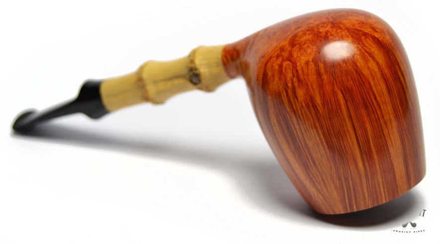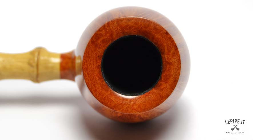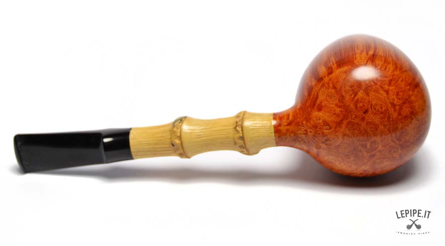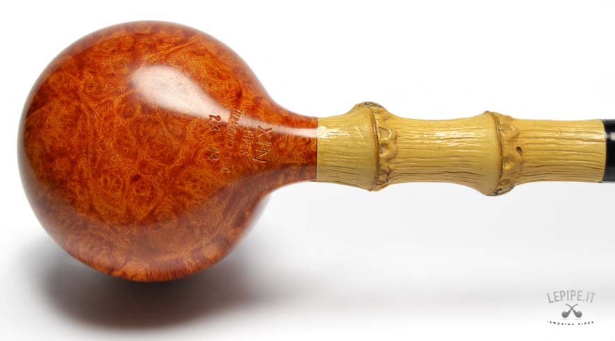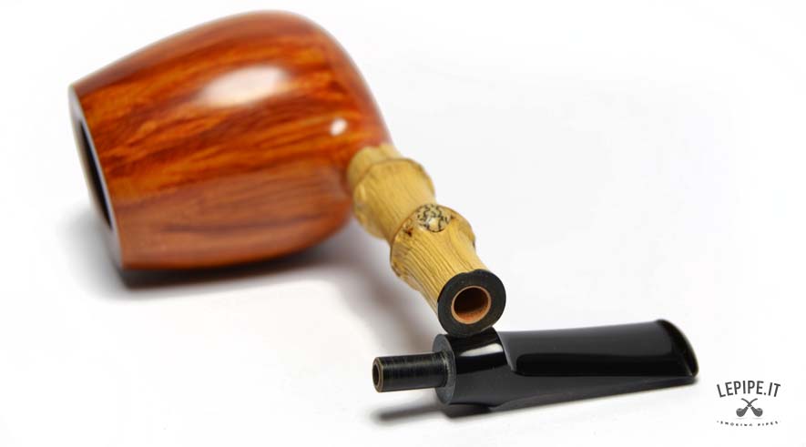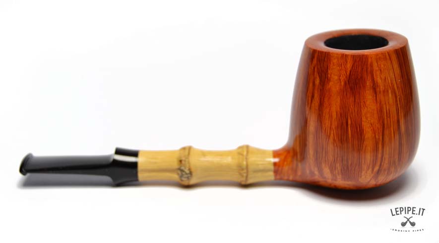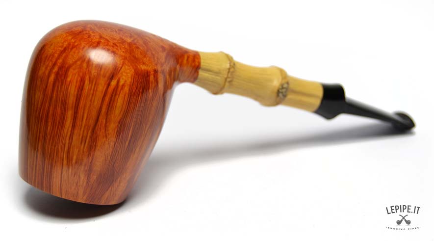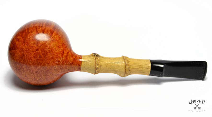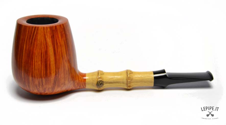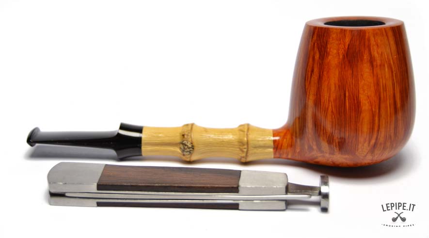 Pipa Xin Li - n. 17 Stand-Up Bocchino in ebanite Senza filtro Liscia Con elaborazione in bamboo Diametro Interno: 19 mm. Diametro Esterno: 41 mm. Lunghezza: 131 mm. Altezza: 48 mm. Peso: 43 gr. Profondità: 35 mm.