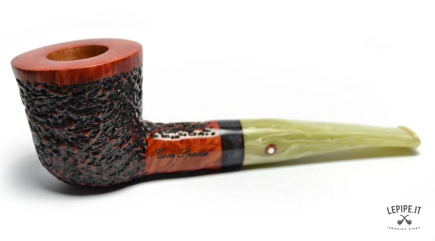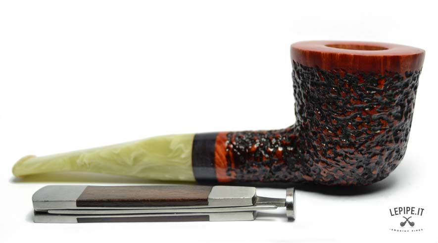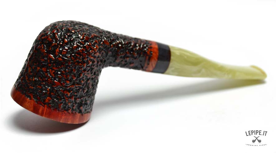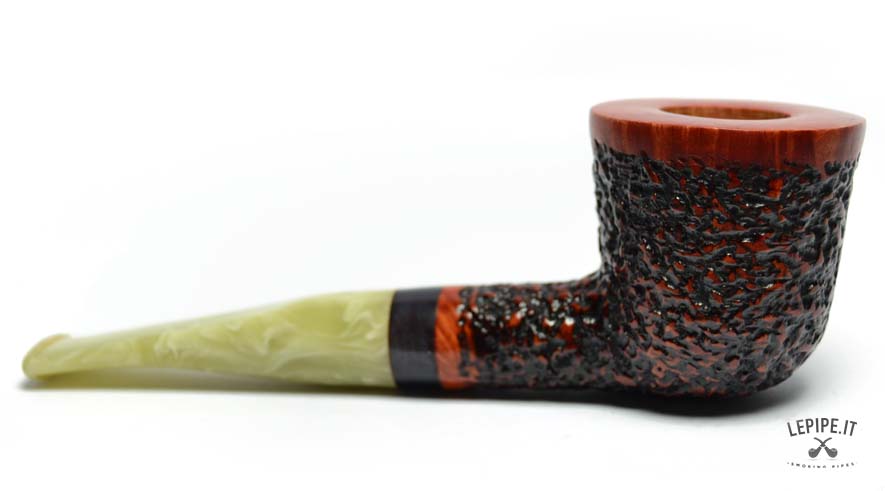 The high-quality briarwood stands out for its combination of rusticated and smooth surfaces: the body of the pipe is deeply rusticated in dark tones, creating a striking contrast with the bowl’s rim, which is polished and showcases warm natural hues.