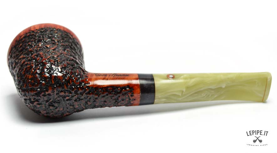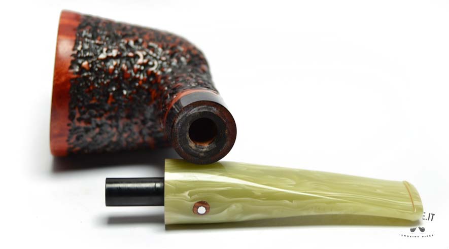 The stem, made of marbled ivory-colored methacrylate, adds a refined and unique touch to the design, perfectly complemented by the dark band connecting the shank. With a total length of 154 mm and a weight of 59 grams, this pipe falls into the medium-weight category, offering a balanced mix of practicality and presence.