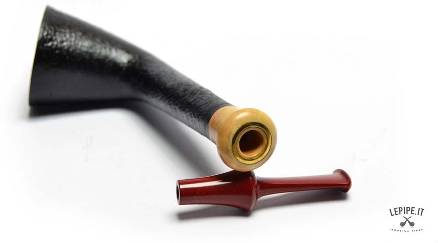 Shank and Mouthpiece: The shank is adorned at its end with an insert of light-colored wood, adding a distinctive and refined touch to the pipe. This transitions harmoniously into the red cumberland mouthpiece, a material valued for its durability and beauty. This combination ensures a comfortable smoking experience while adding a touch of personality to the design.