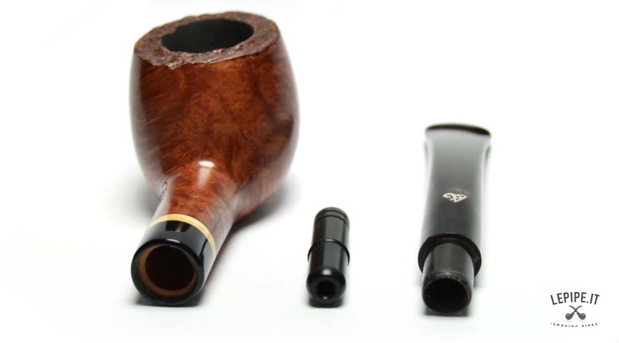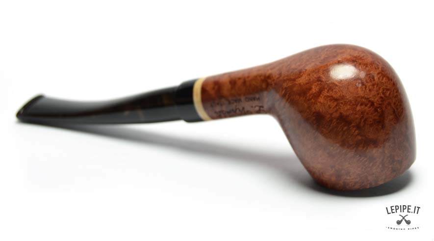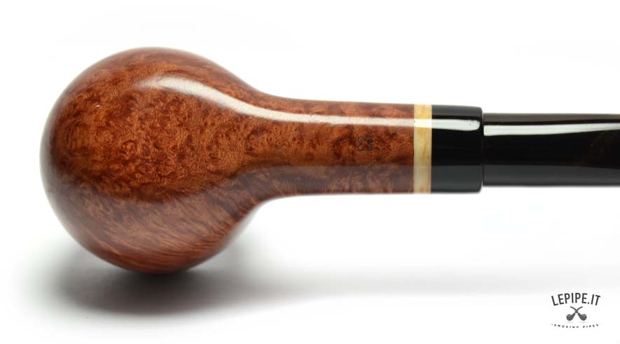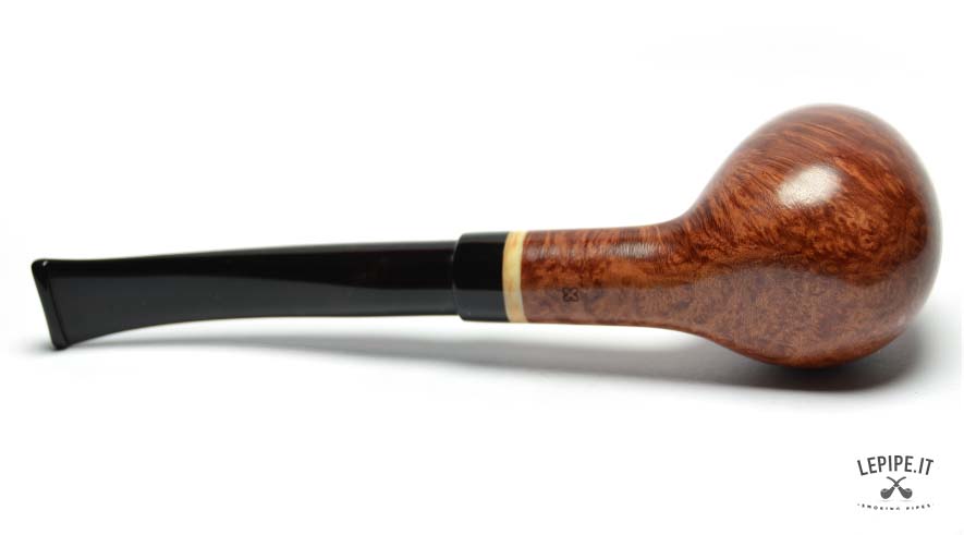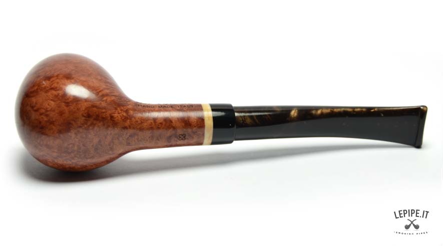 The L. Viprati Bent Pot offers a harmonious blend of tradition and originality, featuring a compact, rounded bowl and a standout element: the natural, rugged rim left unfinished for a touch of raw elegance and individuality. Crafted from flame grain briar, the smooth finish enhances the warm, rich tones of the wood, beautifully complemented by a slightly curved dark marbled acrylic stem. A refined light horn insert between the shank and stem adds a distinctive touch without overpowering the design. Measuring 156 mm in length, 41 mm in height, and weighing just 42 grams, this pipe is impressively lightweight and well-balanced. It features a 9 mm filter chamber, ideal for those seeking a drier, more comfortable smoke. Perfect for those who appreciate traditional shapes with a unique twist.