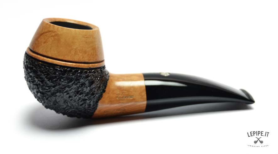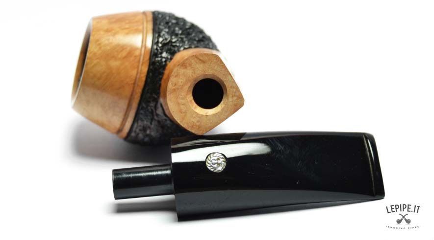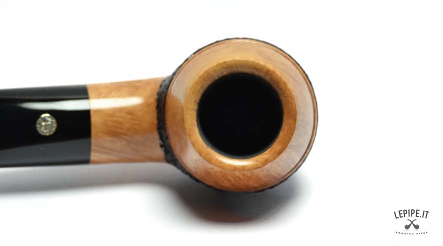The bowl features a striking combination of finishes: the lower section showcases a deep rusticated texture that highlights the natural character of the briar, while the smooth upper rim reveals the warm grain of the wood, creating a refined visual contrast.