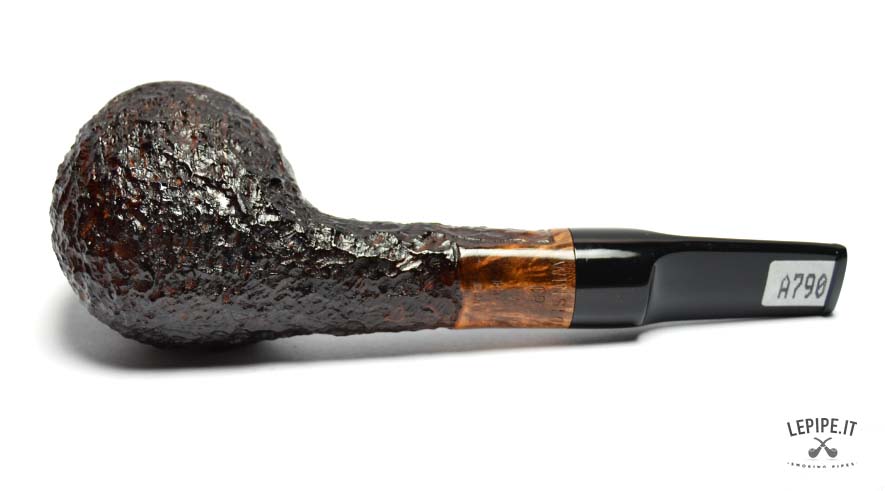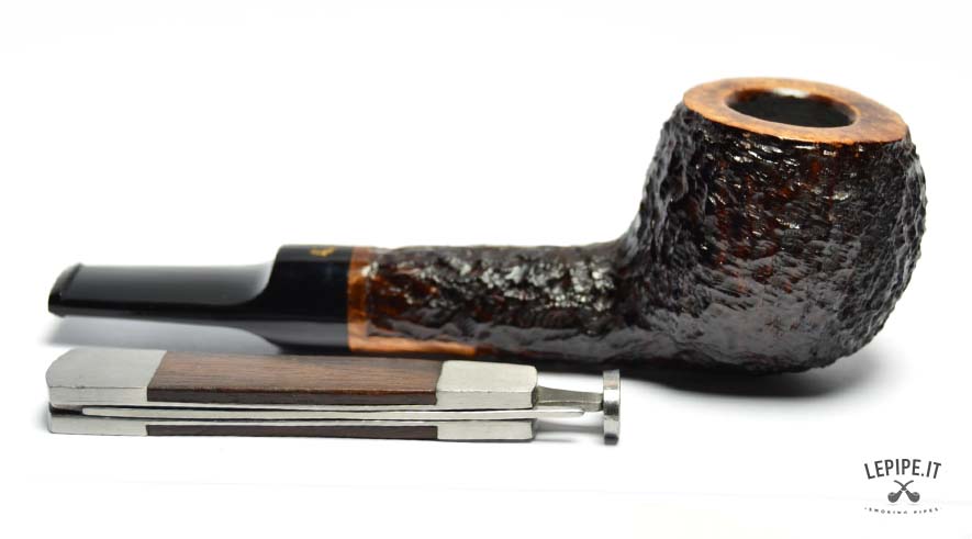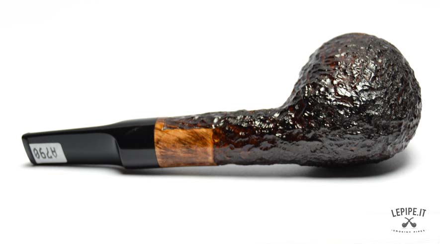 The briar features a deep and irregular rusticated finish, offering a rich tactile experience and enhancing the natural character of the wood. The smooth rim provides an elegant contrast, highlighting the quality of the briar and defining the bowl’s profile with precision.