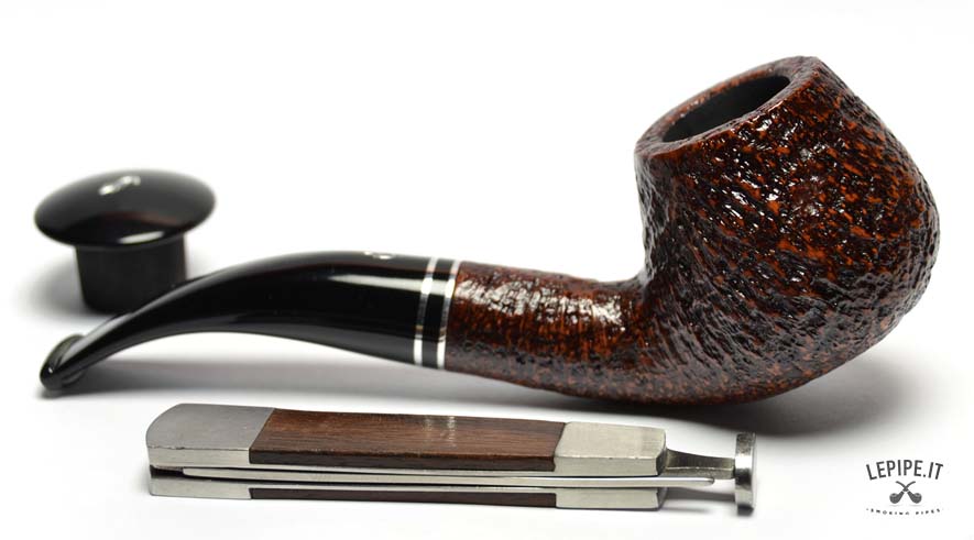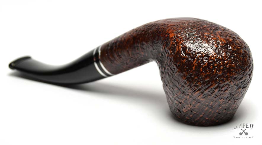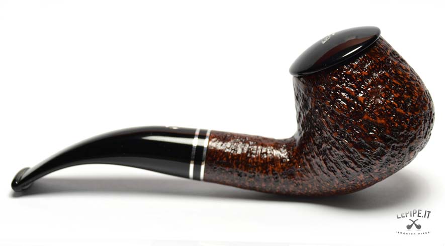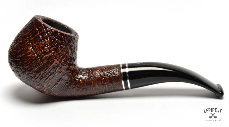 The Savinelli - Monsieur No. 9 is a curved pipe from the Monsieur series, characterized by its Bent Brandy shape that blends elegance with practicality. This model features a sandblasted finish that highlights the quality of the briar, giving it a classic and refined look. The black acrylic stem, adorned with a double chrome band, adds a modern touch to the traditional design.