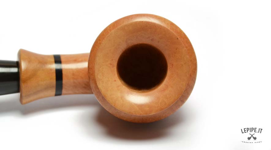 The chimney-shaped bowl, with its elevated rim, is designed to enhance the smoking experience by accommodating longer sessions. The black methacrylate stem complements the light briarwood, creating a balanced and refined aesthetic.