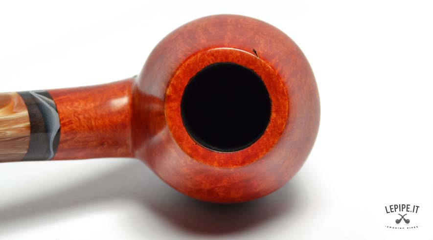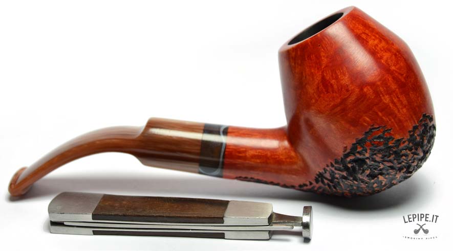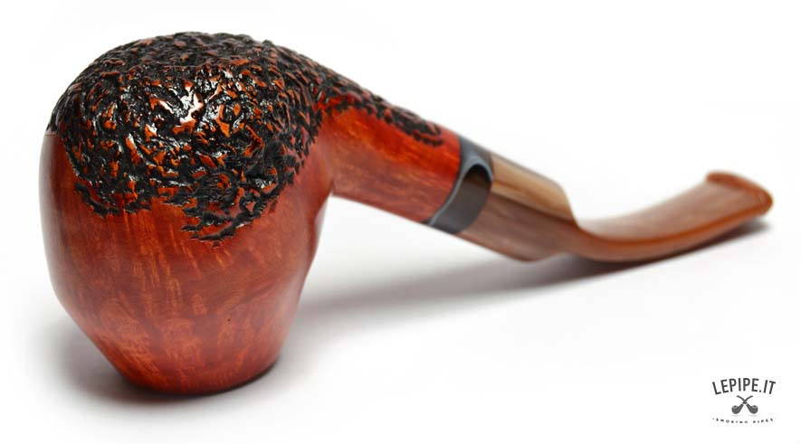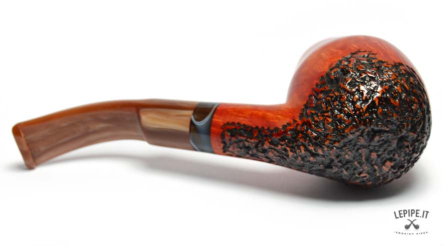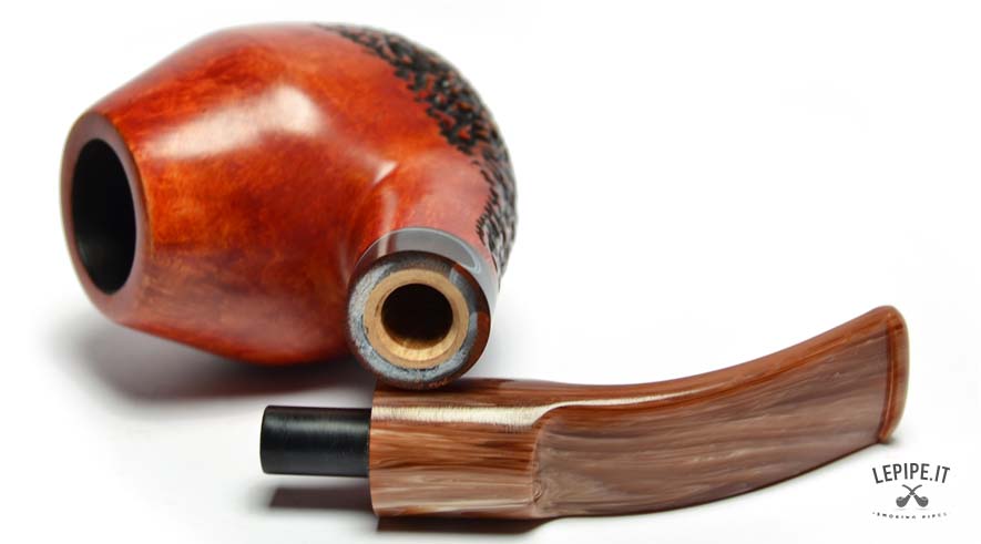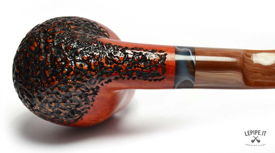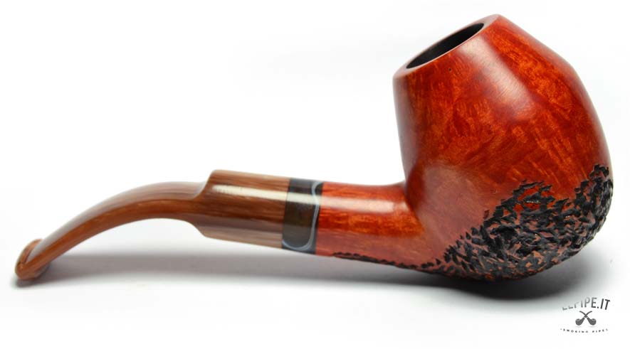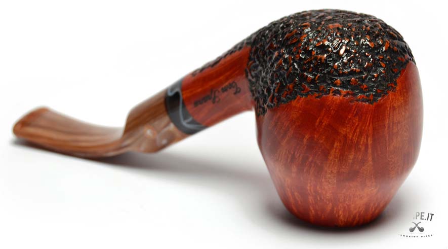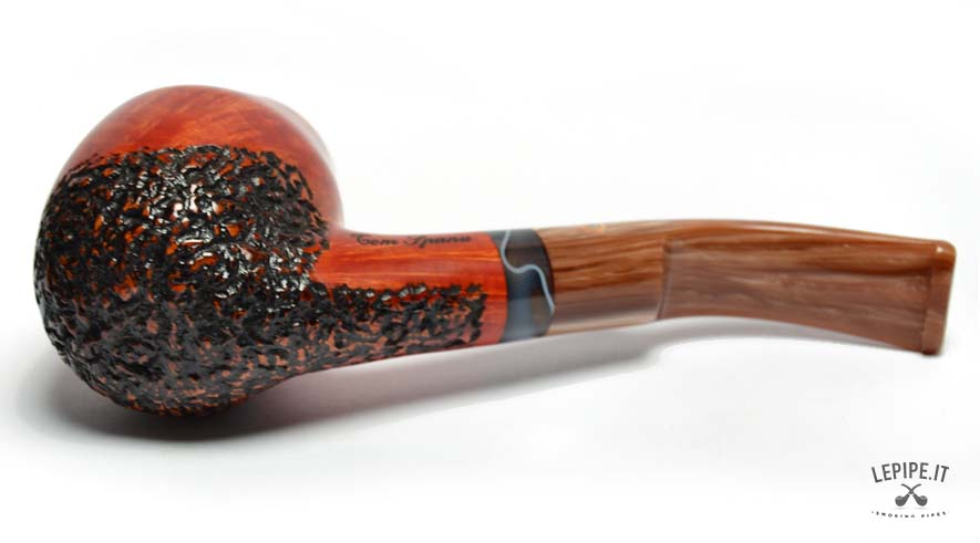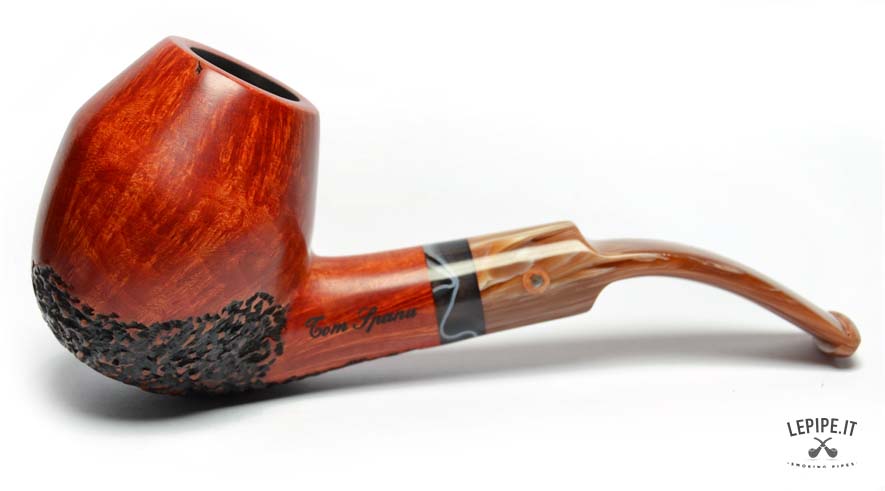 This stunning pipe by Tom Spanu is a remarkable example of Italian craftsmanship, blending elegance and natural charm with meticulous attention to detail. Crafted from high-quality briar, it features a balanced interplay between smooth and rusticated finishes. The smooth sections radiate a warm reddish hue, showcasing the intricate grain of the briar, while the rusticated portions offer a textured contrast, enhancing the pipe’s bold and dynamic character. The bowl is robust and slightly angular, providing ample room for tobacco and ensuring an excellent smoking experience. Its thick walls are designed to retain heat effectively while offering durability. The shank flows gracefully into a marbled acrylic mouthpiece in earthy tones of beige and brown, creating a seamless and refined aesthetic. The translucent black band near the shank adds a modern, sophisticated touch to the design. The engraved “Tom Spanu” signature on the shank affirms its authenticity and highlights the artisan’s dedication to excellence. The pipe’s easy-to-disassemble tenon system ensures effortless maintenance, making it an excellent choice for both seasoned smokers and collectors who appreciate functional art. This pipe is not merely a smoking tool but a celebration of Italian heritage and artisanal passion. Perfect for moments of relaxation or as a standout piece in any collection, it transforms every smoke into an extraordinary experience. Its harmonious design and luxurious materials make it a timeless masterpiece.