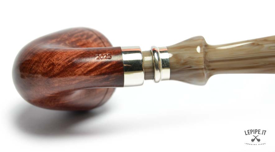 The methacrylate mouthpiece in an ivory hue adds a touch of class, perfectly complementing the warm tones of the wood. This version comes without a filter, delivering a direct and intense smoking experience.